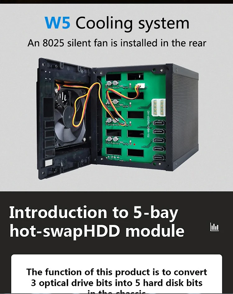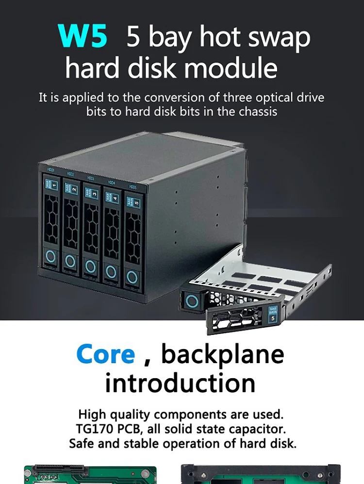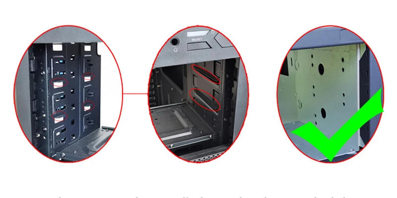 El Módulo de conexión en caliente de 5 bahías está instalado en el chasis. El chasis debe tener tres posiciones de unidad óptica estándar. ¡La pieza en bruto convexa en la posición de la unidad óptica debe aplanarse con una herramienta!
