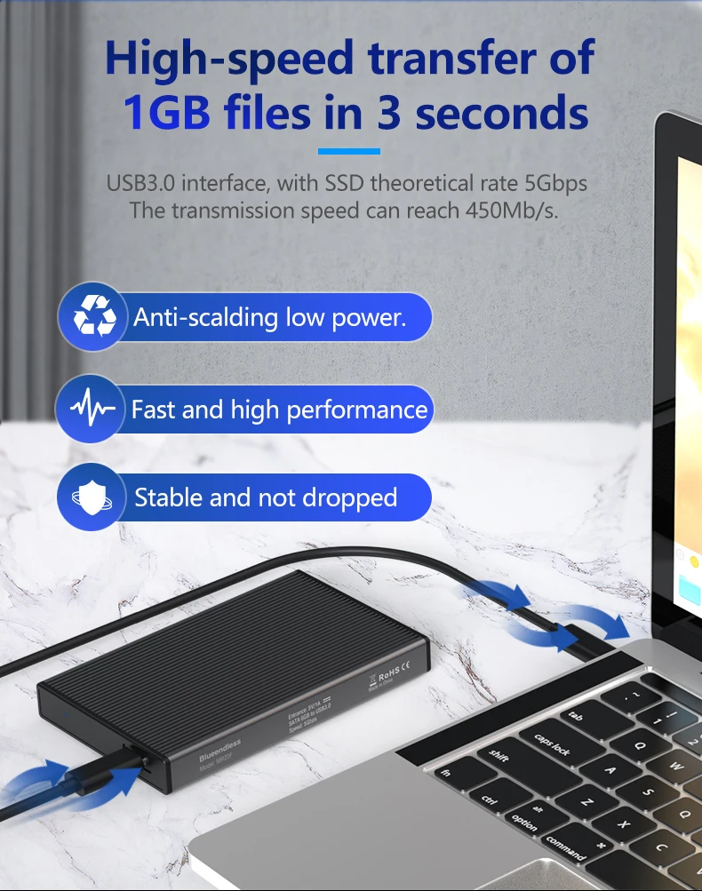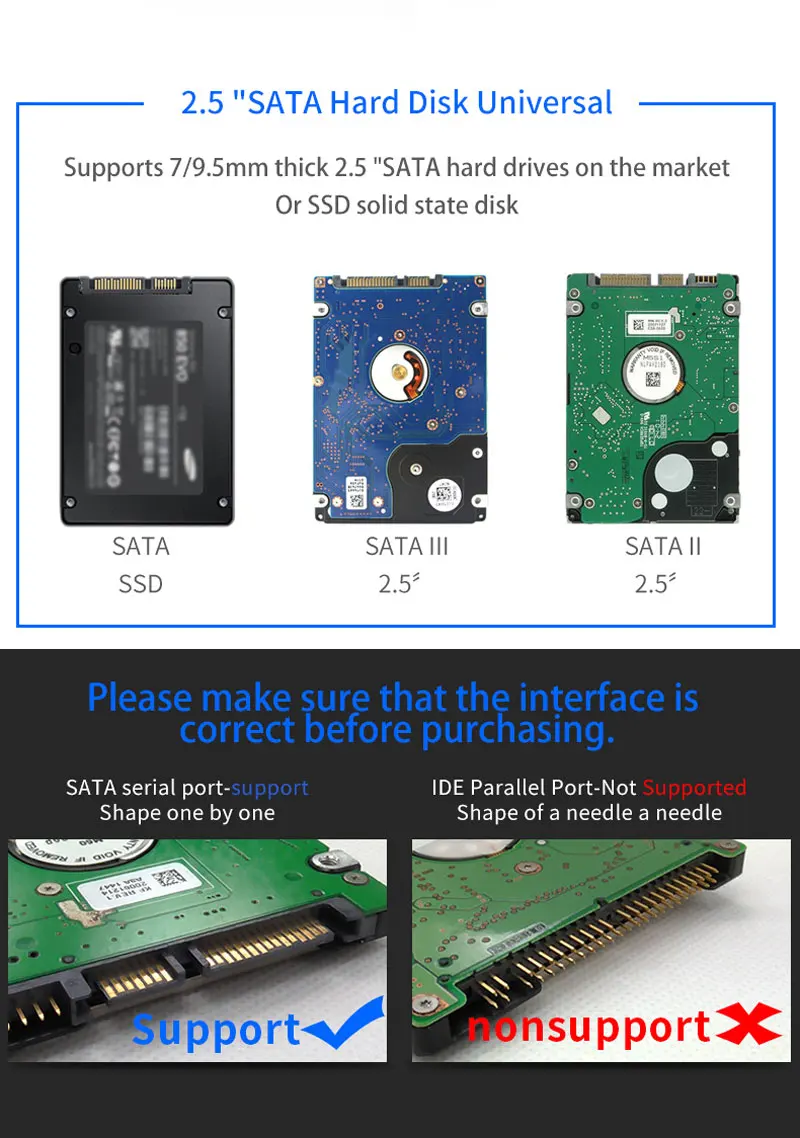 Consejos de uso1. Para un nuevo disco duro sin usar, es necesario hacer una partición al principio, en caso contrario no se puede reconocer.2. Para lograr la función UASP, asegúrese de que el dispositivo, el sistema operativo y el controlador tengan la función UASP activada.3. Retire siempre con seguridad su disco antes de desenchufar este producto.4. El sistema Win XP de 32 bits no admite discos duros superiores a 2TB.5. Para el modelo tipo C, ya que los discos duros de interfaz SATA admiten una velocidad de transferencia máxima de 6Gbps, por lo que la carcasa HDD tipo C podría alcanzar hasta 6Gbps.6. No admite disco duro que esté alimentado con CC de 12V. (Confirme el modo de alimentación desde la parte posterior del disco duro)Caja de HDD USB 3,1 Tipo C: 6gbps (520 MB/s máx.)