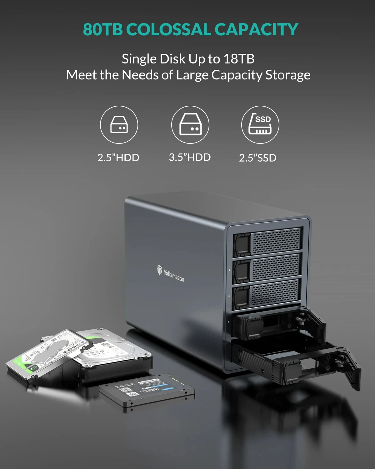 La carcasa para disco duro externo Yottamaster de 5 bahías tiene CINCO bandejas mentales extraíbles, que se adaptan a SSD de 2,5 pulgadas donde la velocidad es más importante y HDD de 3,5" cuando es importante maximizar la capacidad de almacenamiento.Los discos duros se fijan mediante tornillos provistos, que pueden protegerse eficazmente contra golpes y daños en la interfaz.