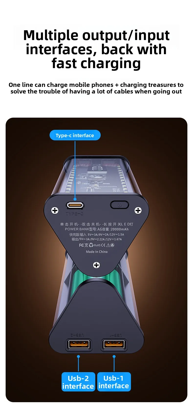 TYPE-C output: 5V/3A 9V/2.2A 12V/1.67A 10V/2.25A