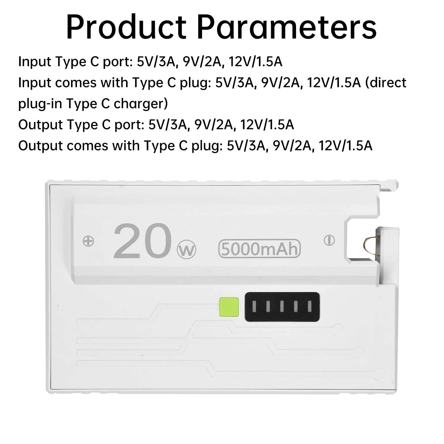 Descripción del producto: 20W totalmente compatible con protocolos de carga rápida, con metralla chapada en oro (mejor en gran medida la eficiencia de conversión), con protección anti-reversa (las baterías cargadas casualmente, cargadas al revés no quemarán la placa), se pueden cargar con 1 sección de 3.Baterías de litio 7V21700 (cabeza plana) una llave para expulsar el cambio de energía.Admite modo dual, tipo de carga rápida y interruptor de tipo de corriente pequeño a voluntad, viene con enchufe de expulsión, enchufe tipo C que admite carga bidireccional, soporte de entrada para cargador directo.