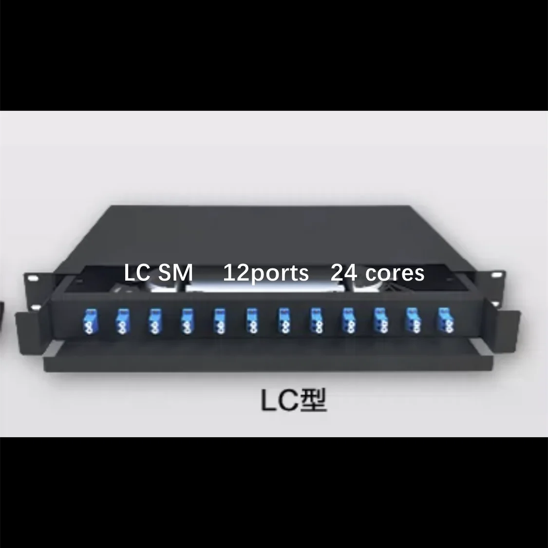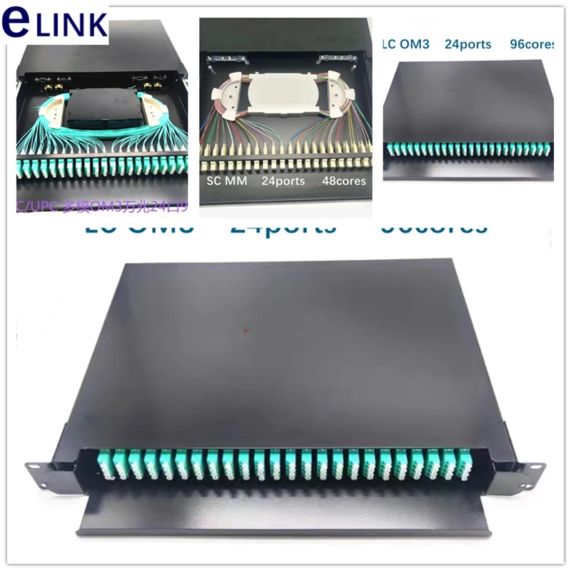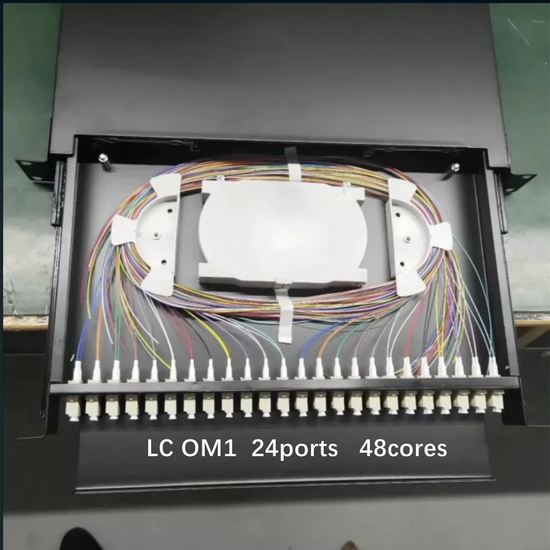 Caja de terminación de fibra óptica de 24 puertos OM3 96 núcleos LC QUAD MM instalada completamente con adaptador y panel de conexión de metal pigtail 19 "pulgadas Rack