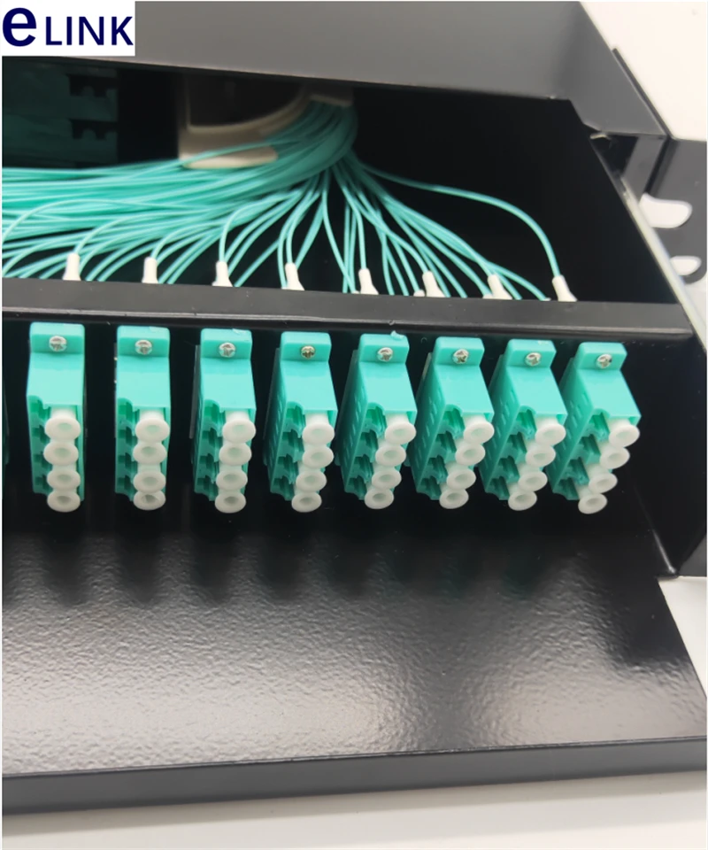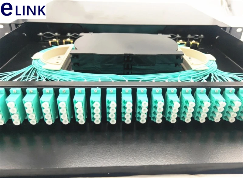 Comprar Caja de empalme de fibra óptica, OM3 96 núcleos, LC QUAD MM, totalmente con adaptador, panel de conexión de metal Pigtail, estante de 19 "pulgadas
