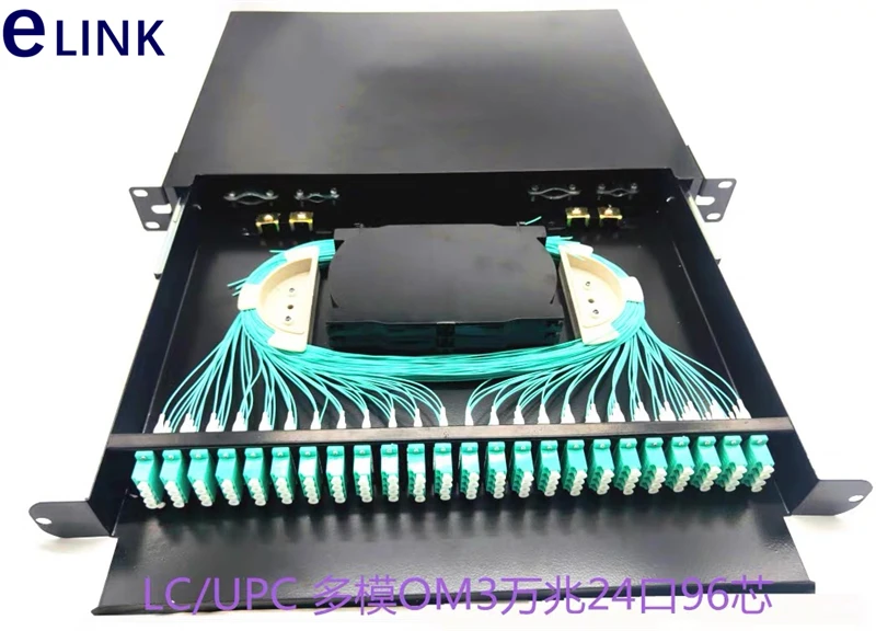 Caja de terminación de fibra óptica de 24 puertos OM3 96 núcleos LC QUAD MM instalada completamente con adaptador y panel de conexión de metal pigtail 19 "pulgadas Rack