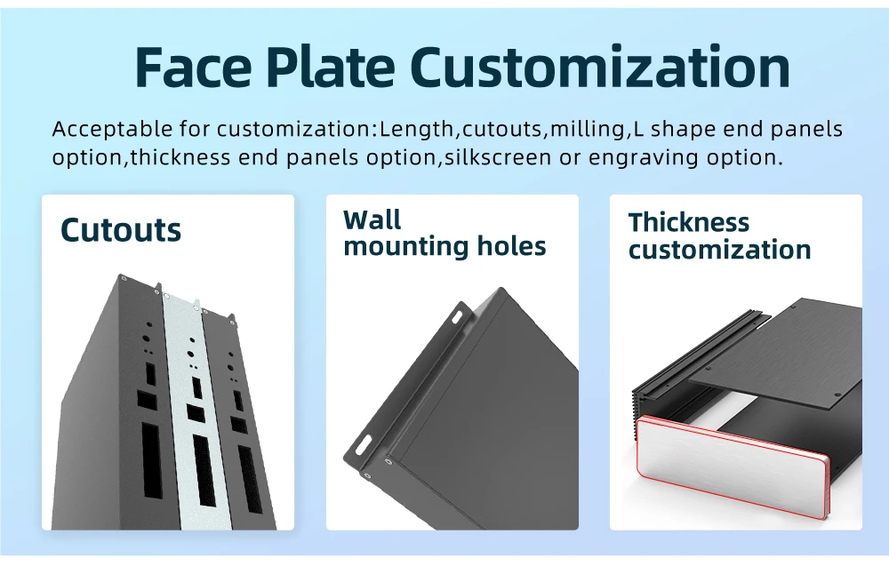 1. Paneles de ranura 2. Personalización de tamaño completo 3. Más opciones de color para anodizado 4. Personalización de recortes 5. Grosor de la personalización de la placa frontalEspecificaciones: