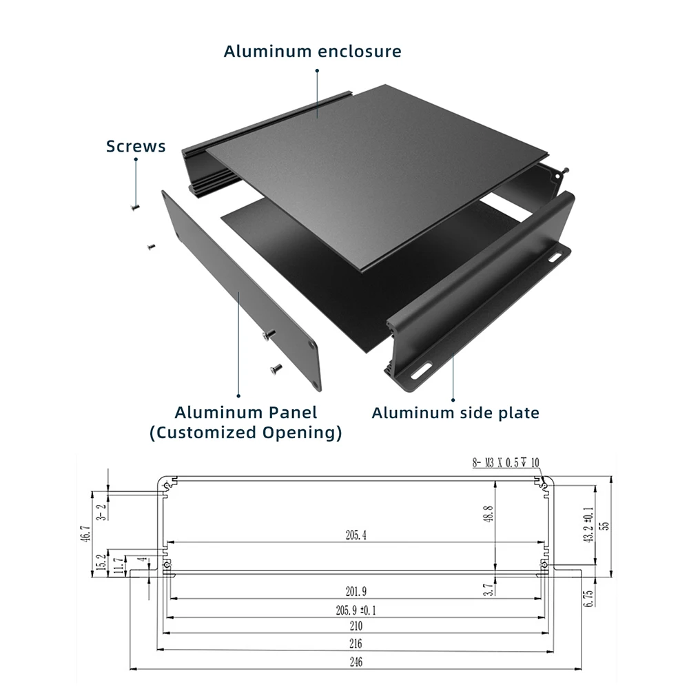 Adopta perfil de aluminio de alta calidad, paneles laterales extruidos, longitud y ancho disponibles, tamaño personalizado, placa frontal de maquinaria CNC, ampliamente adecuada para varios campos de carcasas.Características: