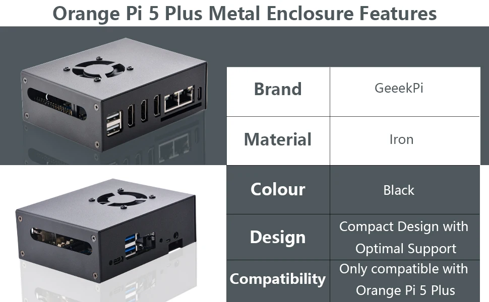 Material premium:Fabricada con metal de alta calidad, esta funda protectora proporciona una durabilidad y protección excepcionales contra daños físicos, lo que garantiza que su Orange Pi 5 Plus permanezca seguro y funcional.