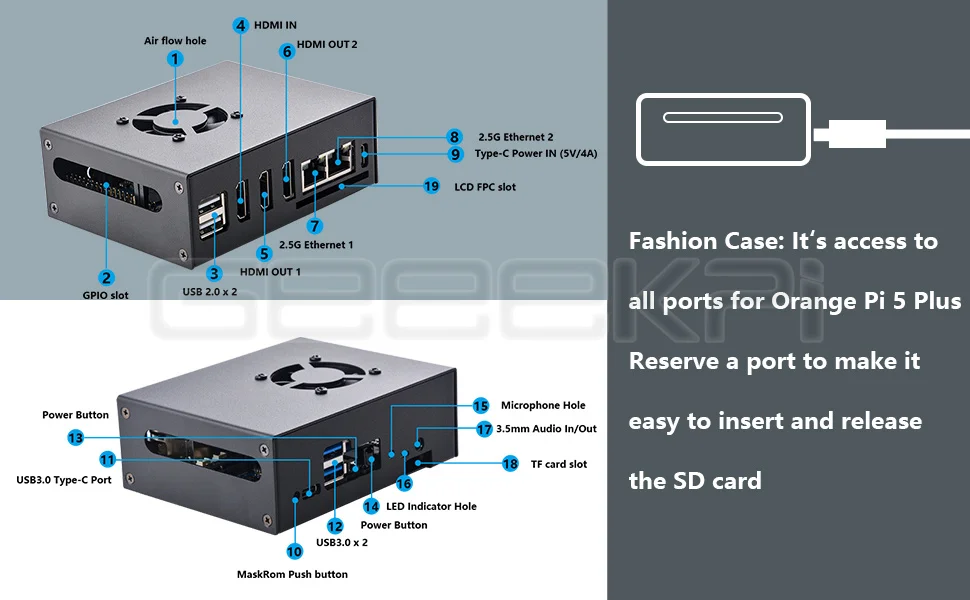 Sistema de refrigeración optimizado:Equipado con un ventilador de refrigeración de alto rendimiento pero silencioso y disipadores térmicos adhesivos conductores térmicos de primera calidad, este estuche garantiza una disipación de calor eficiente para evitar que el rendimiento acelere y extender la vida útil de su Orange Pi 5 Plus.