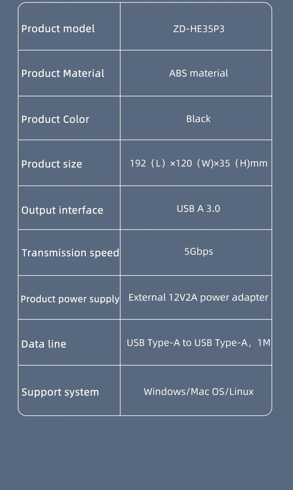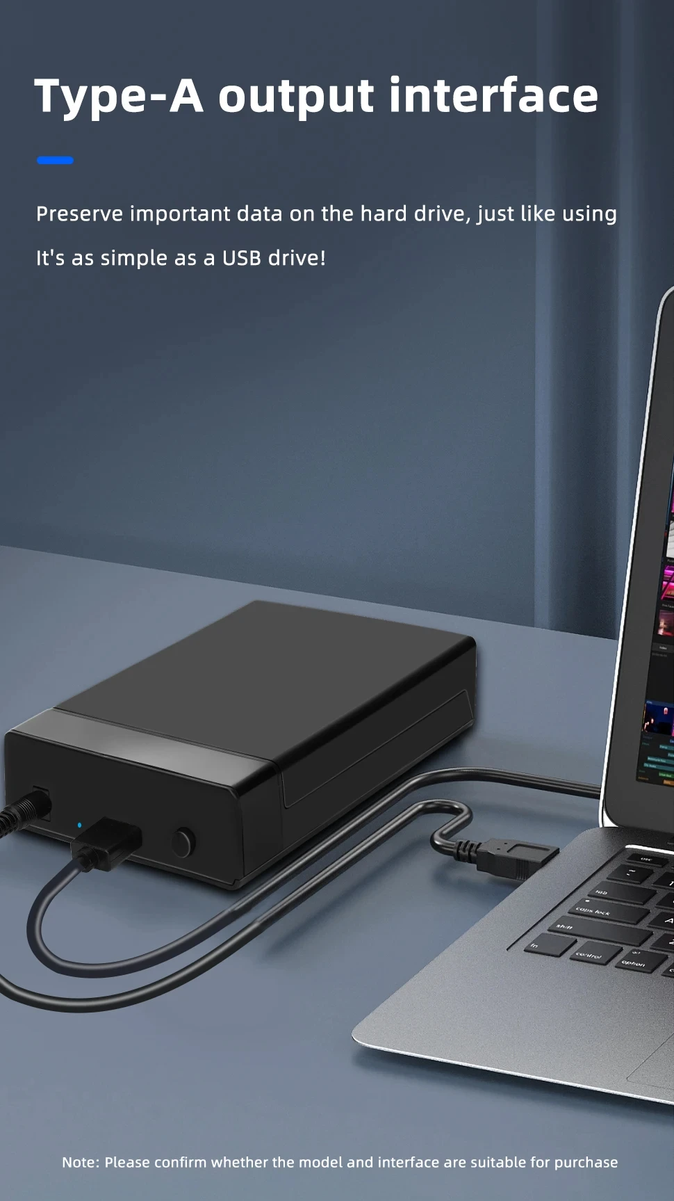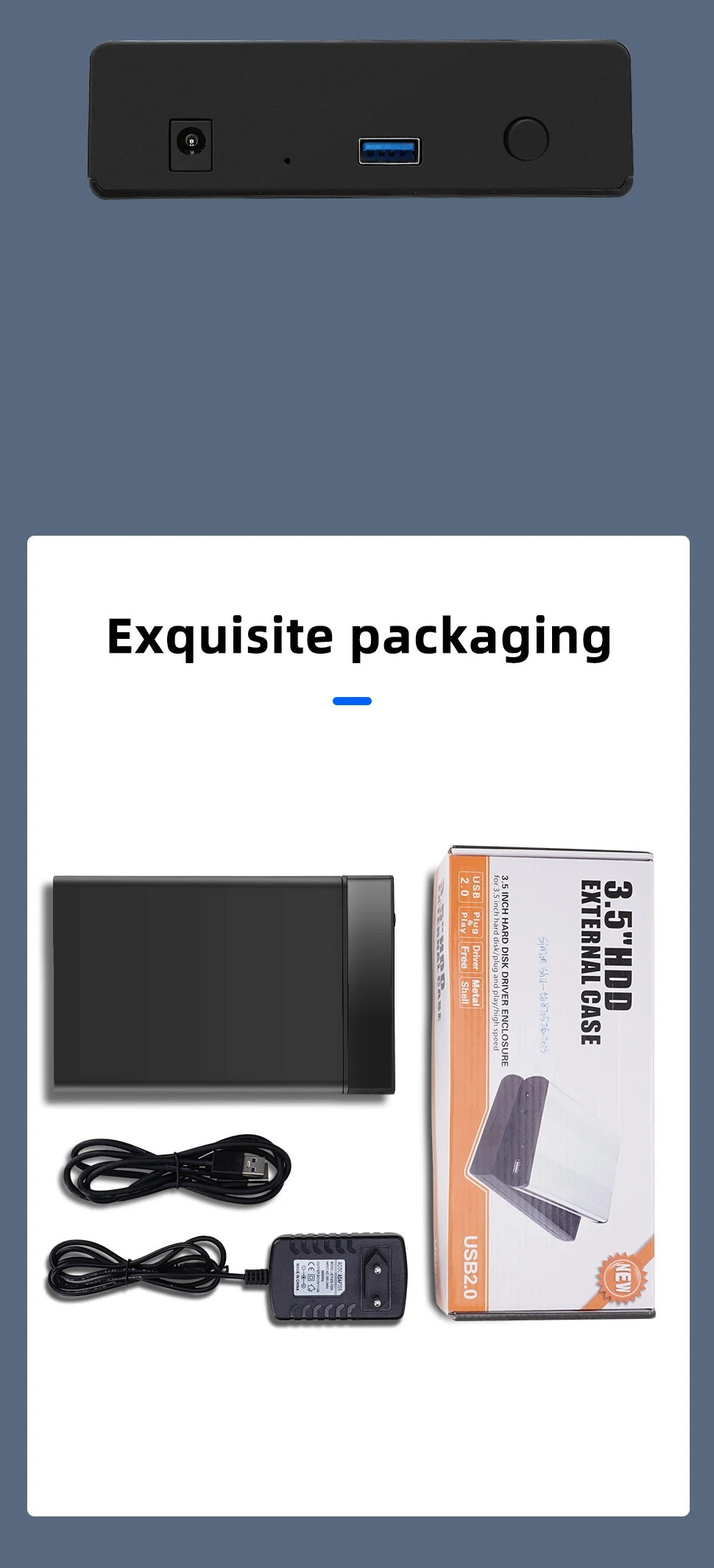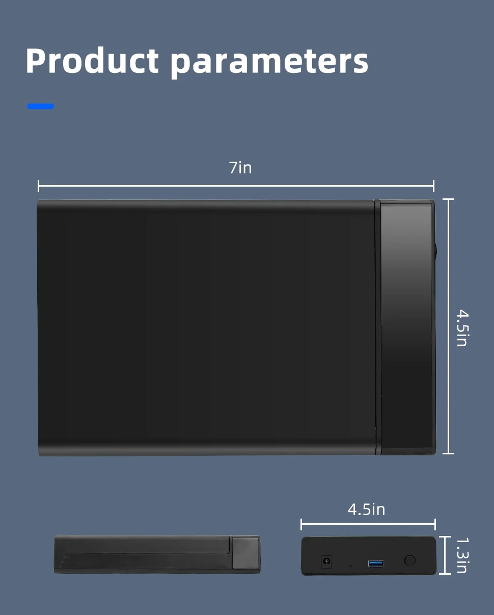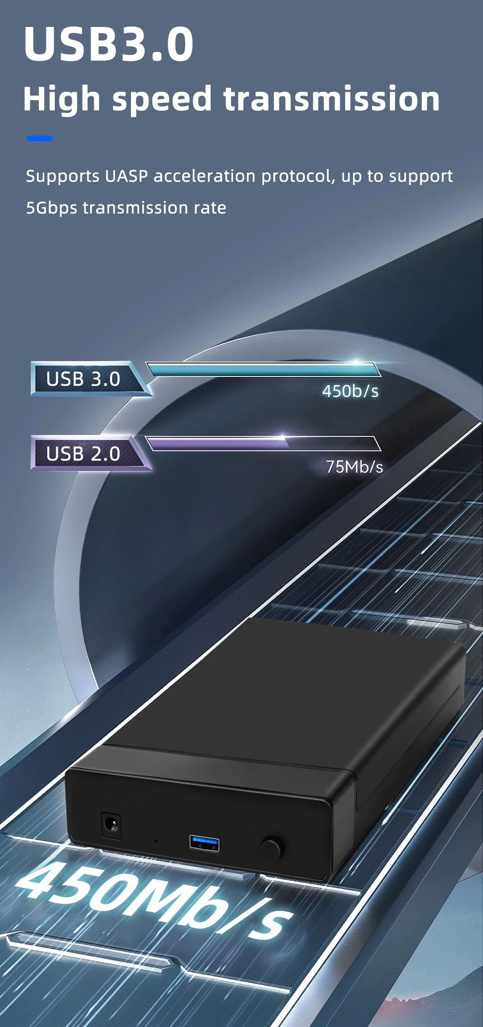 3.5" External Hard Drive Enclosure Easily connects your 3.5/2.5 inch SATA SSD HDD to PC, laptop, and other device with USB3.0 interface for massive data transfer and portable storage.