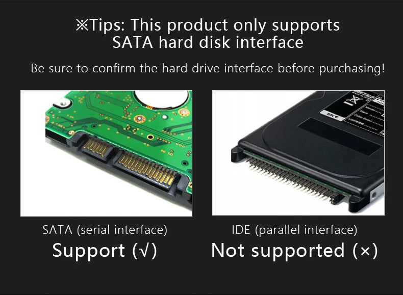 1.Admite todos los HDD SATA I/II/III estándar de 7 mm/9.5 mm/15 mm y 2,5 pulgadas y SSD de hasta 6 TB (máx.)
