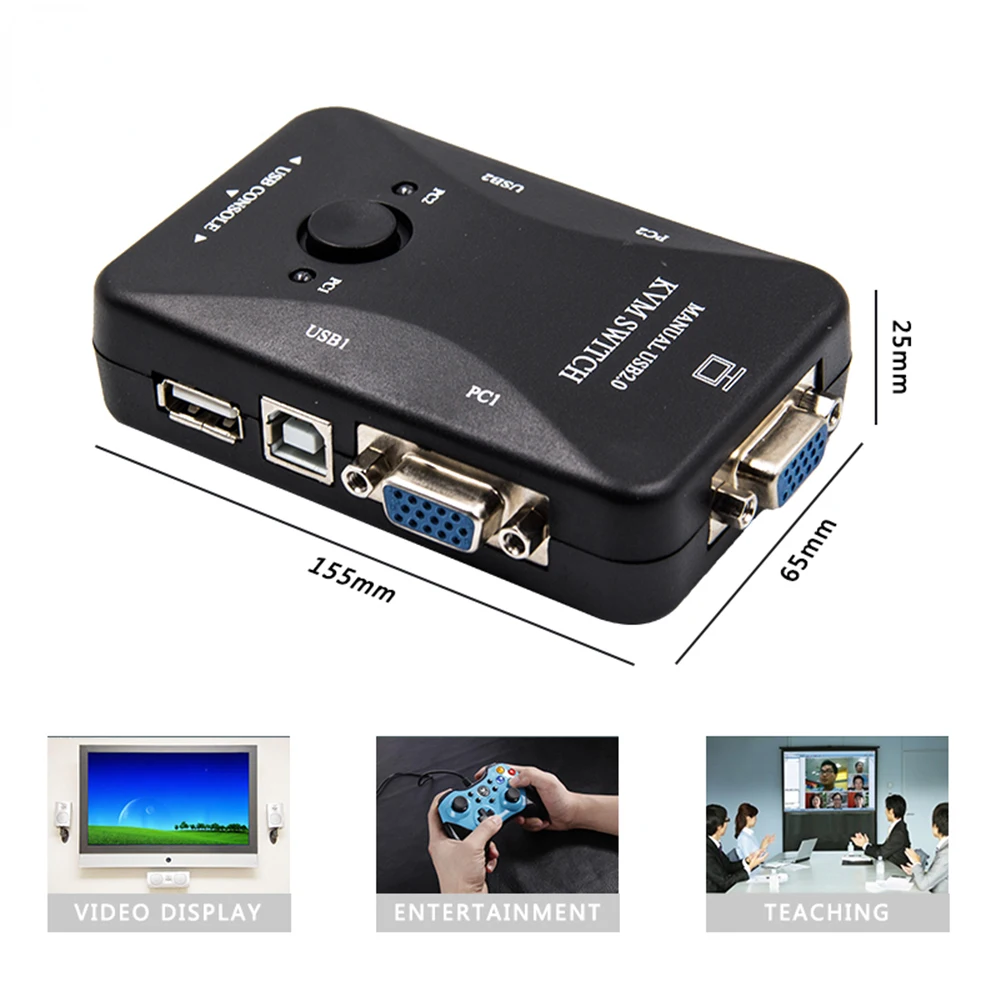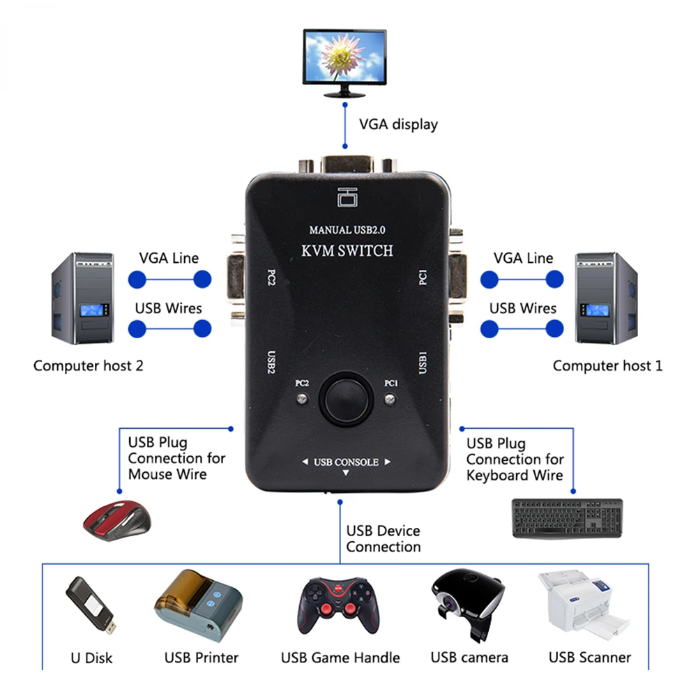 Comprar Caja de interruptor KVM compatible con HDMI, 2 puertos USB, 2 en 1, salida 1920x1080, VGA, caja divisora para compartir teclado, ratón, Monitor, ordenador