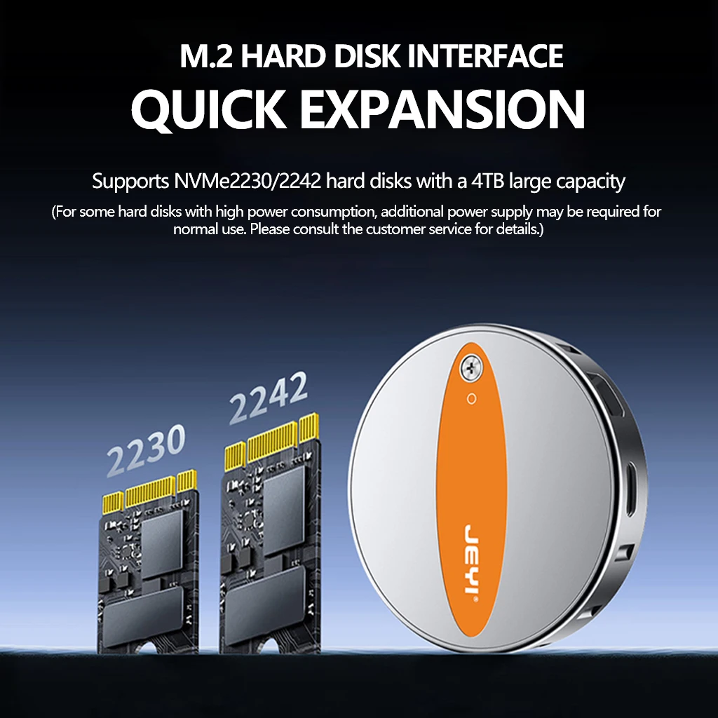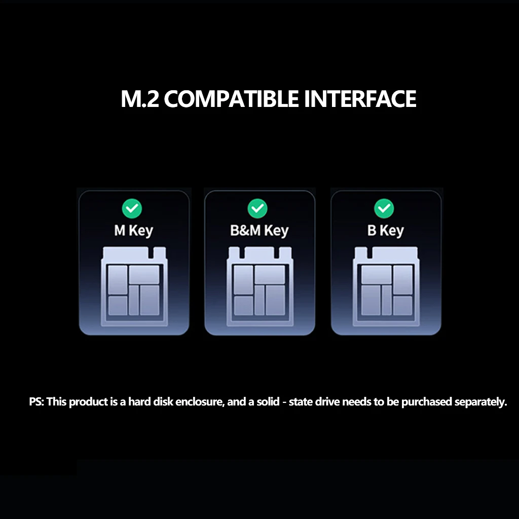 M.2 interfaz de disco duro, expansión de capacidad rápida: admite discos duros NVMe 2230/2242, gran capacidad de 4 TB (algunos discos duros pueden requerir una fuente de alimentación adicional para funcionar normalmente, consulte con el servicio al cliente para obtener más detalles), M.2 interfaces compatibles: tecla M/tecla B&M/tecla B (PD: este producto es una carcasa de disco duro, las unidades de estado sólido deben comprarse por separado);