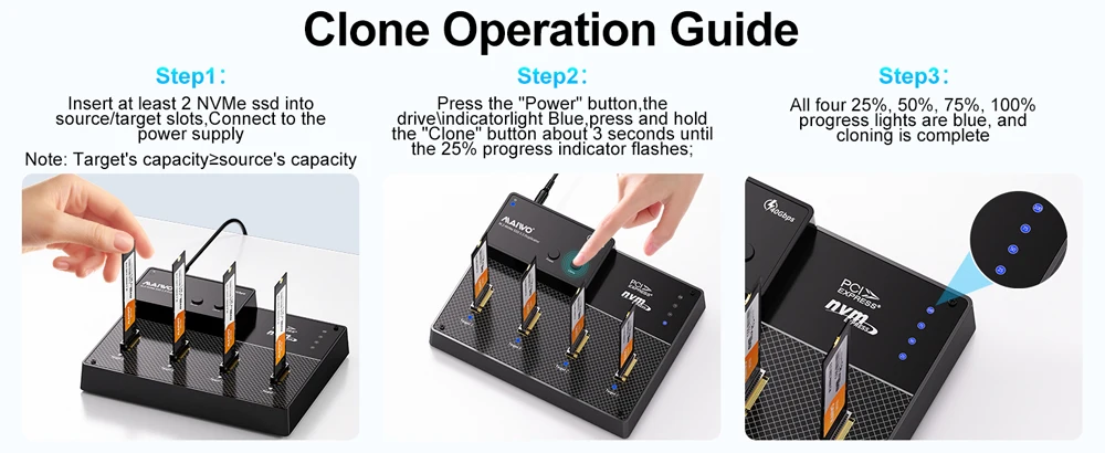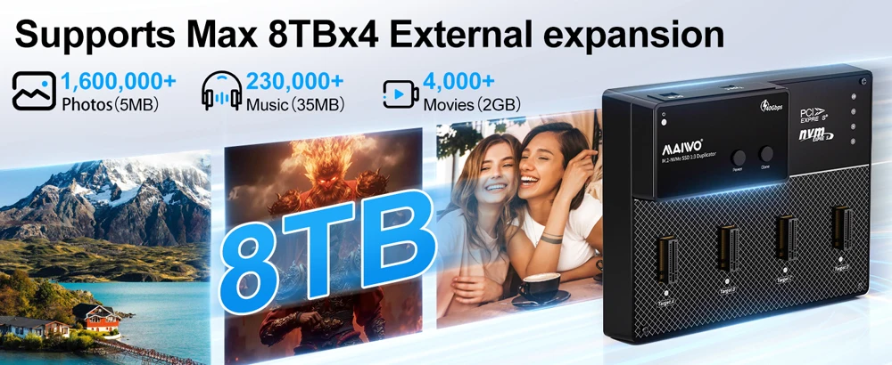 【Funcionalidad de clonación 1 a 3】Permite clonar desde una unidad de fuente hasta hasta tres unidades de objetivo simultáneamente.Útil para crear copias de seguridad o duplicar unidades para distribución.Ideal para editores de vídeo, fotógrafos y jugadores que necesitan acceso rápido a archivos grandes.