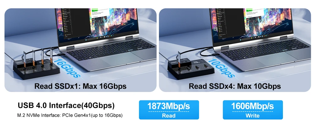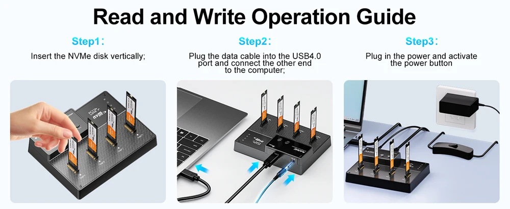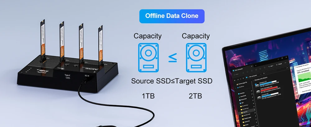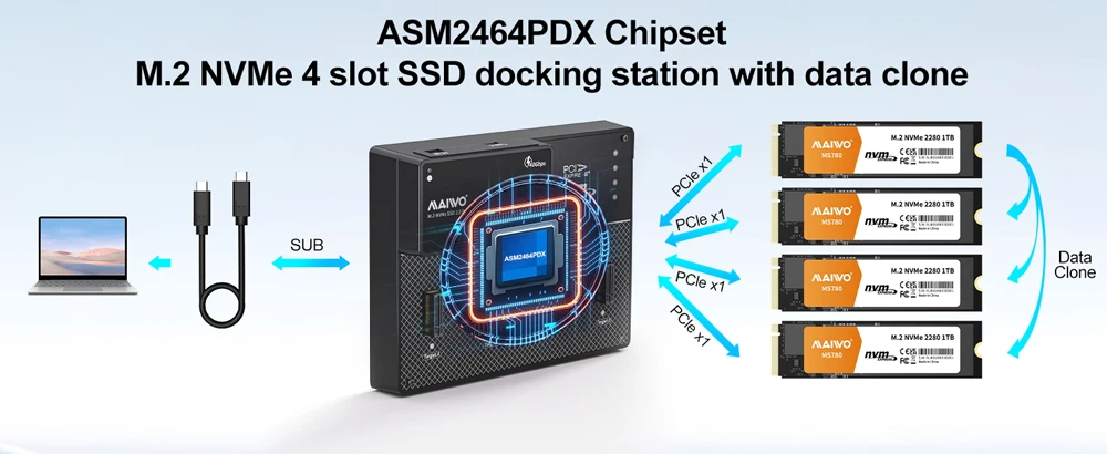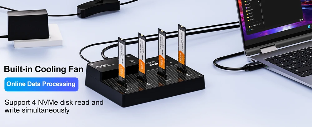 【Dock SSD NVMe M.2 de 4 bahías con capacidades de clonación y ventilador de refrigeración】Admite software RAID, que es una solución de almacenamiento de alto rendimiento diseñada para profesionales, entusiastas y empresas que necesitan velocidades de transferencia de datos rápidas y gestión avanzada del almacenamiento.