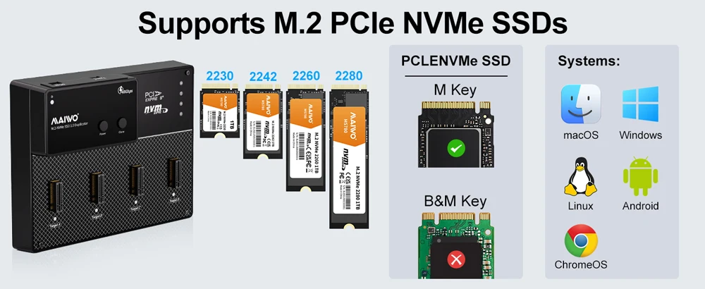 【Compatible con SSD NVMe M.2 de 4 bahías】 Admite hasta cuatro SSD NVMe M.2 simultáneamente.Compatible con varias longitudes (2230, 2242, 2260, 2280.22110) para mayor flexibilidad, aplicable a M-key.