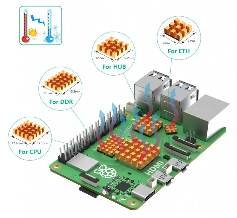 [] Con un ventilador de refrigeración silencioso de 40 mm y disipadores de calor de cobre, proporcione a Raspberry Pi 5 un buen efecto de enfriamiento.