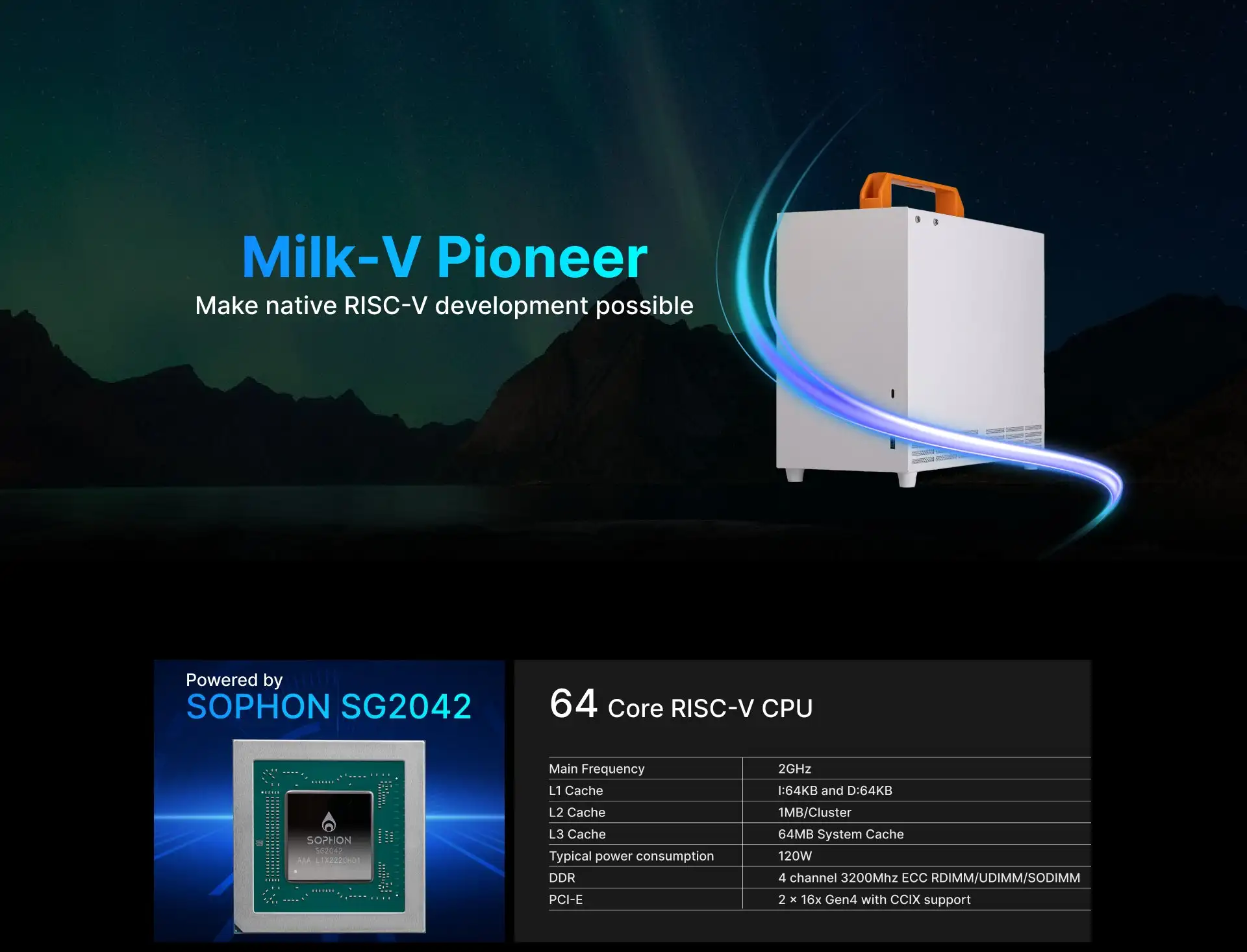 El chip de servidor SG2042 se basa en la arquitectura de conjunto de instrucciones (ISA) de y cuenta con un chip de nivel de servidor de 64 núcleos diseñado para satisfacer las necesidades informáticas de alto rendimiento. Ofrece escalabilidad, flexibilidad y personalización, con circuitos integrados que incluyen caché de alta velocidad (L3Cache MB 64), controlador de memoria (4 DDR4-3200), interfaz de red, y controlador PCI Express® (x32 PCI Express Gen4.0), compatible con sistemas operativos de uso general como Linux. El SG2042 tiene una velocidad de reloj de 2 GHz y un diseño que consta de 16 clústeres, cada uno con 4 núcleos de 1/2 "y 2", con un núcleo de 2 "y un núcleo de 2", 2 ", 2", 2 ", 2", 2 ", 2", 2 ", 2", 2 KB, 6 ", 2", 2 ", 2", 2 ", 4", 4 ", 4", Cada clúster comparte un diseño L2 de 1 MB. El caché del sistema L3 tiene una capacidad de 64 MB. El SG2042 admite la interconexión entre dos chips a través de CCIX y tiene 4 controladores de DDR4-3200, compatibles con RDIMM, ECC y UDIMM. El chip también tiene 32x interfaces PCI E Gen 4,0, eMMC5.1 integrado, SDIO 3,0, SPI x2, I2C X4, UART X4 y Gigabit Ethernet MAC.