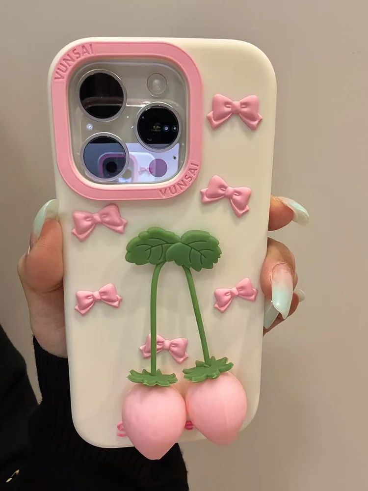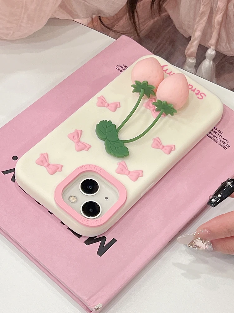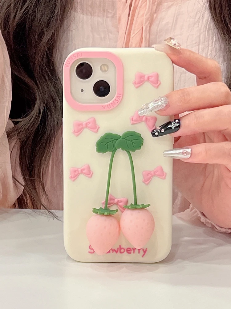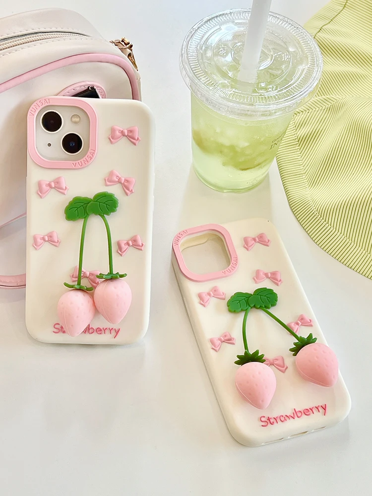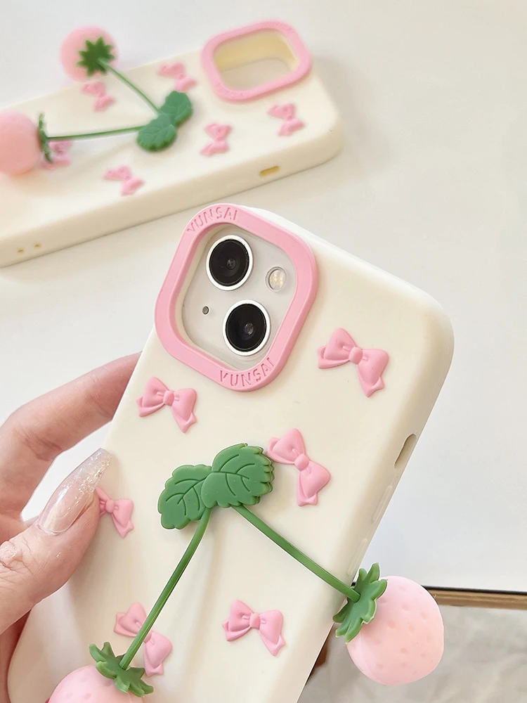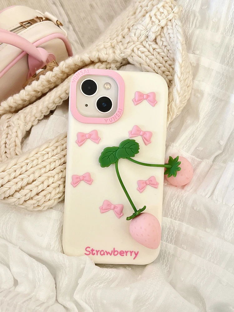 Funda de teléfono de silicona con lazo 3D rosa y fresa para iPhone 16 15 13 14 12 Pro Max, funda trasera suave