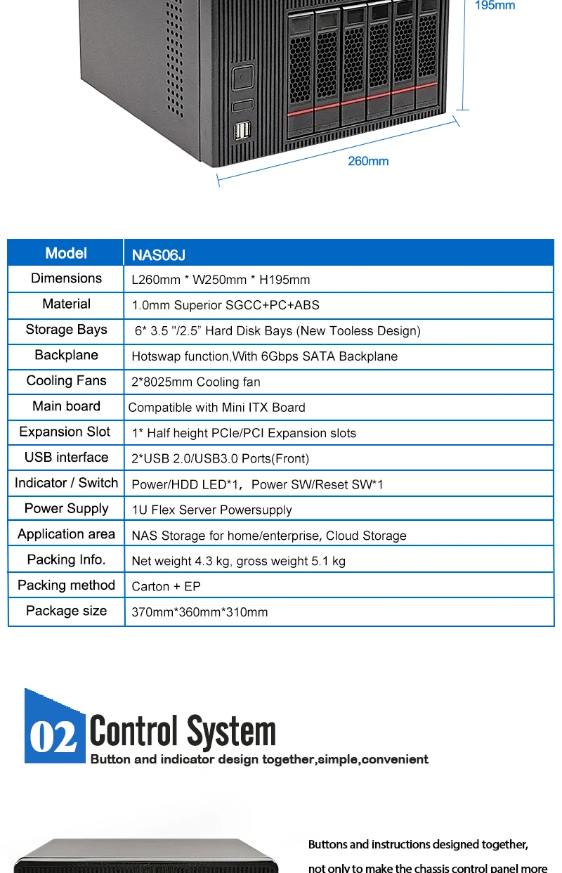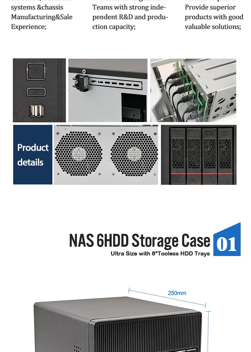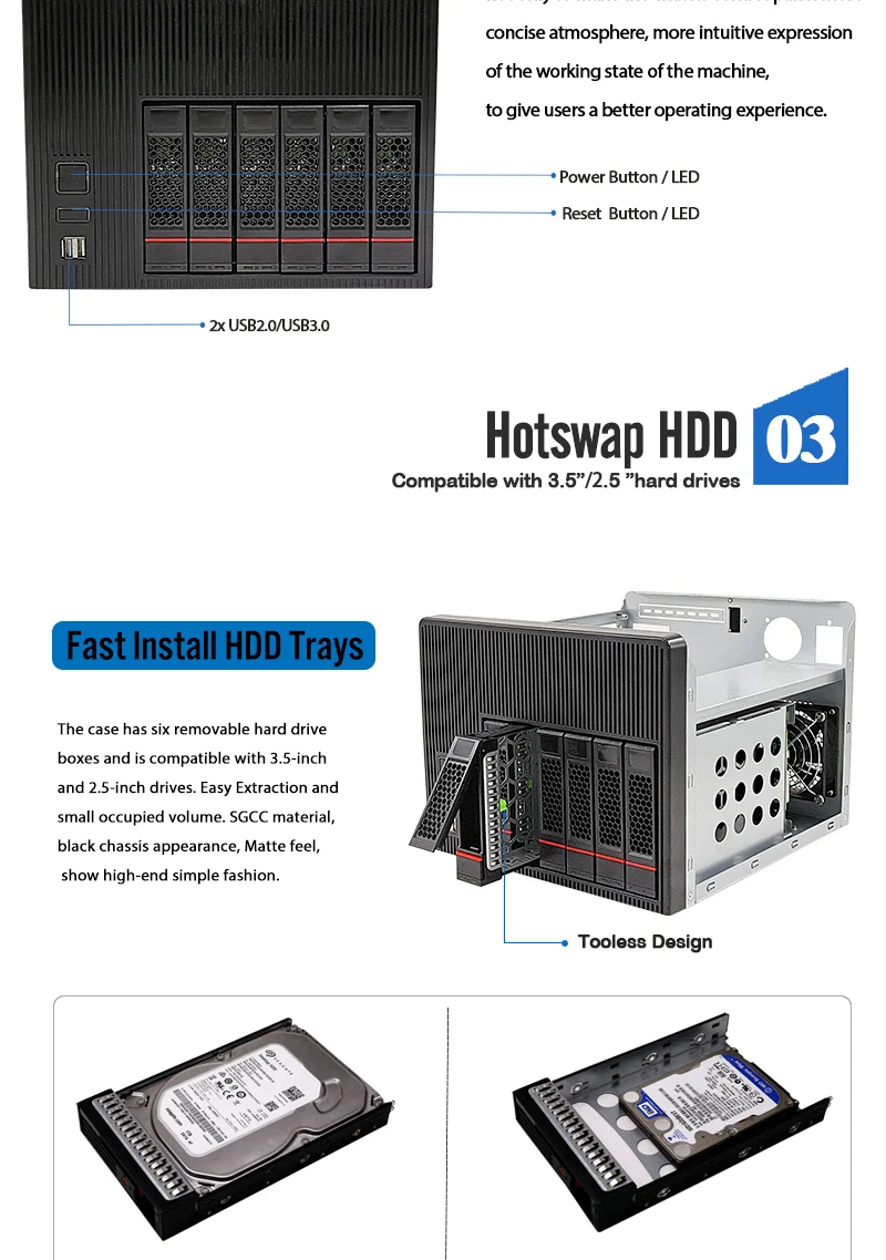 Descripción del productoSomos un fabricante profesional de servidores.Este estuche de almacenamiento NAS de 6 compartimentos es nuestro último producto de I+D. Con bandejas de disco duro Hotswap Toolsess. Haga que la instalación del disco duro sea mucho más fácil y rápida.Puede admitir un controlador de disco duro con capacidad de almacenamiento de hasta 6x12 TB y es de calidad confiable.¡Tenga la seguridad de comprar!