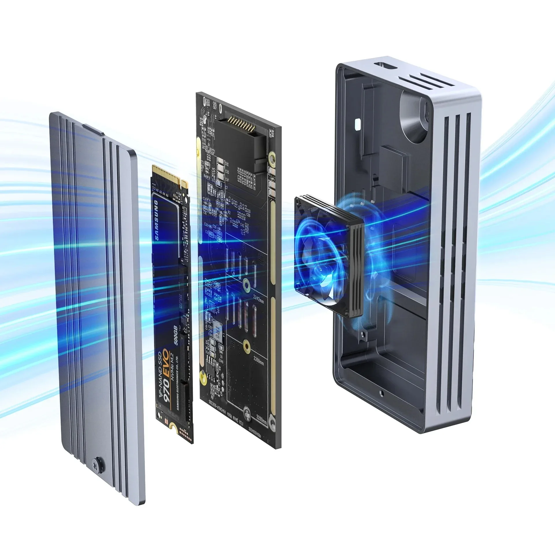 Ventilador de refrigeración incorporado: rápida disipación del calor a través de rejillas de ventilación en ambos extremos de la carcasa SSD, evitando una alta generación de calor y afectando las velocidades de transmisión.Nota: No es necesario instalar grasa térmica en su SSD para evitar afectar la ventilación del conducto de aire.