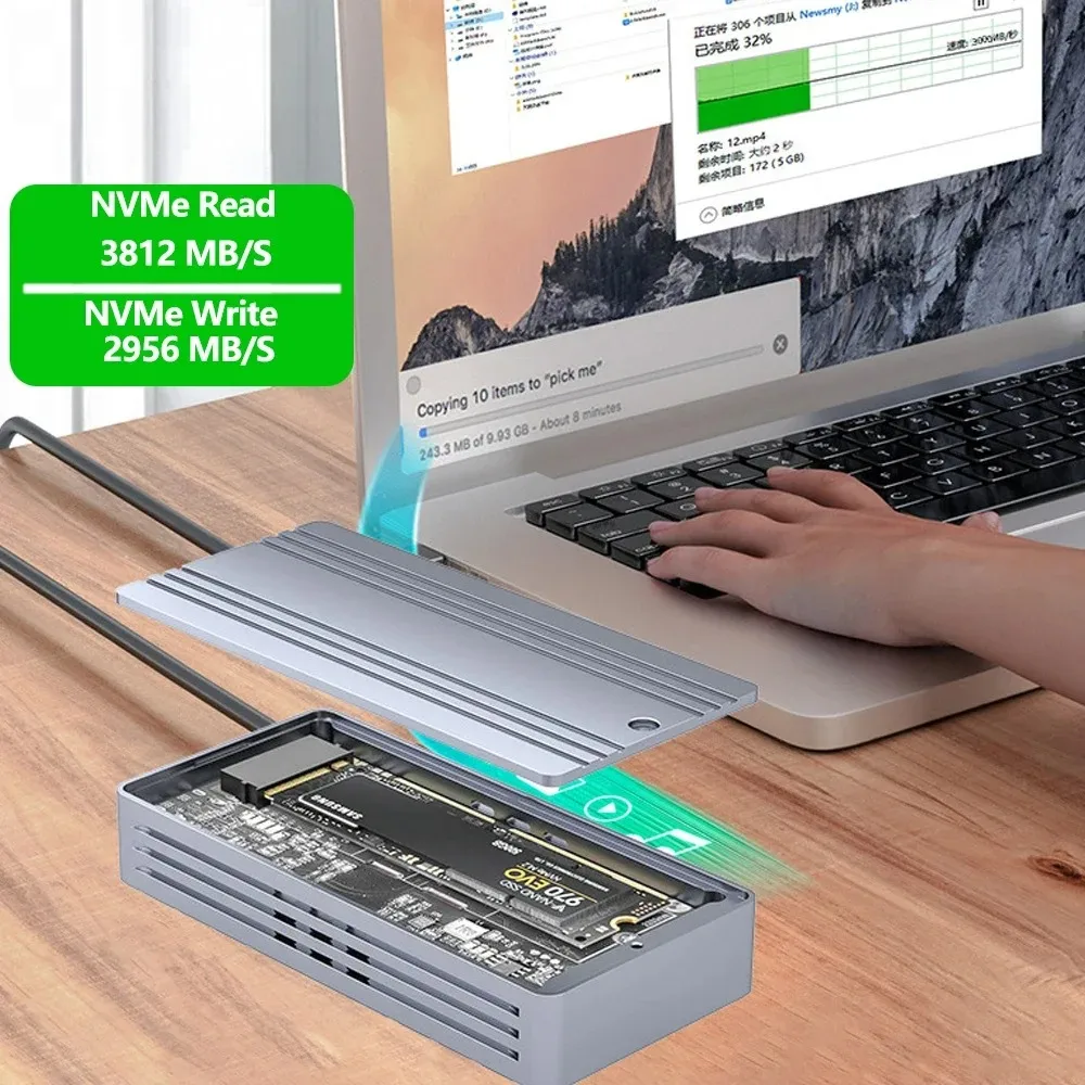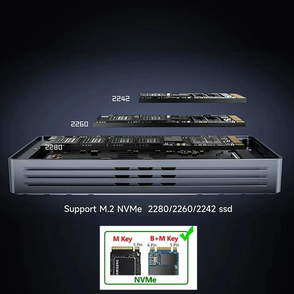 Expansión de hasta 4 TB: le recomendamos que utilice un SSD NVMe de clave M/llave B&M de hasta 4 TB. Este es solo una carcasa de SSD y no incluye ningún SSD NVMe.