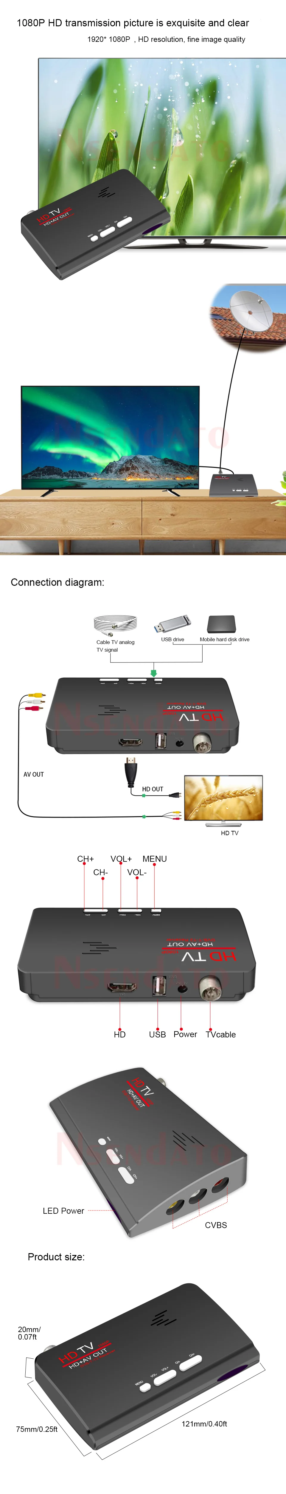 Características1. Nuevo y de alta calidad2. Protocolo de soporte3. Admite teletexto.4. Salida de vídeo compuesto para TV.5. Salida HDMI para monitor LCD/CRT.6. Ver DVB-T TV en el monitor de la PC, no requiere software.7. Reproducción de programas de TV/Radio digital terrestre.Especificaciones1. Conector RF de entrada (2, 2, 1, 1, 2, 1 hembra)2. Rango de frecuencia: 174-230MHz (VHF) , El-862MHz 470MHz para banda (UHF)