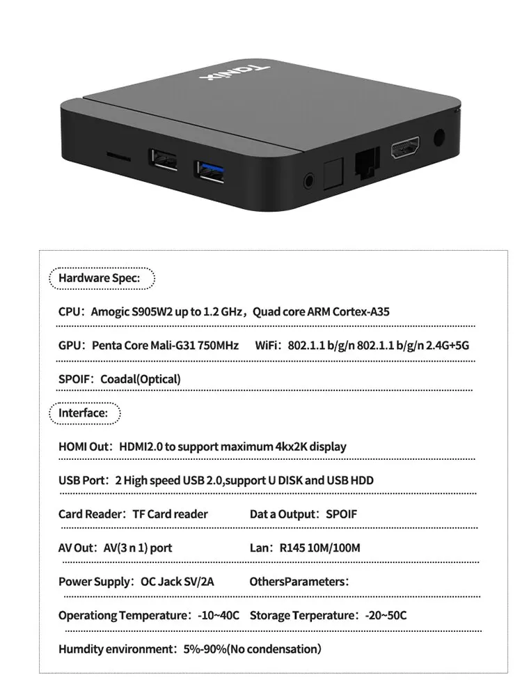 • Salida de vídeo de alta definición:Disfrute de imágenes nítidas con la salida de vídeo de alta definición de la Tanix W2 Smart TV Box.