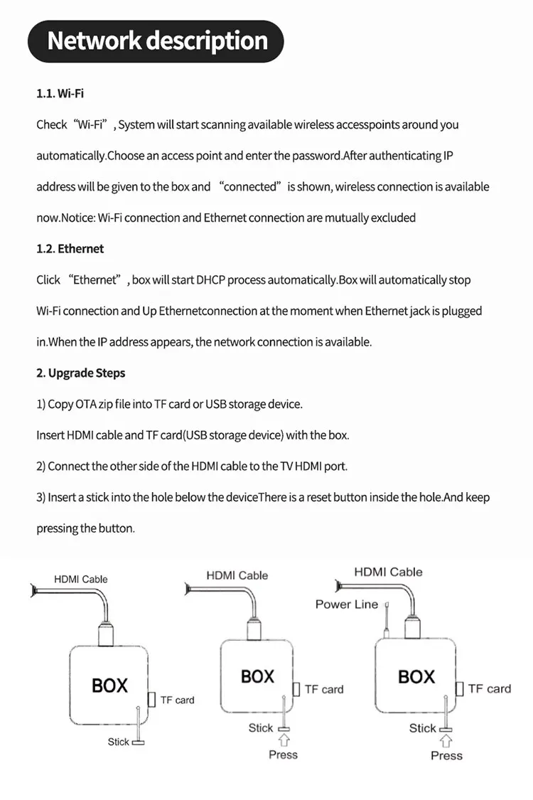 1) Copia el archivo OTAzip en la tarjeta TF o en el dispositivo de almacenamiento USB Inserte el cable HDMI y la tarjeta TF (dispositivo de almacenamiento USB) con la caja.