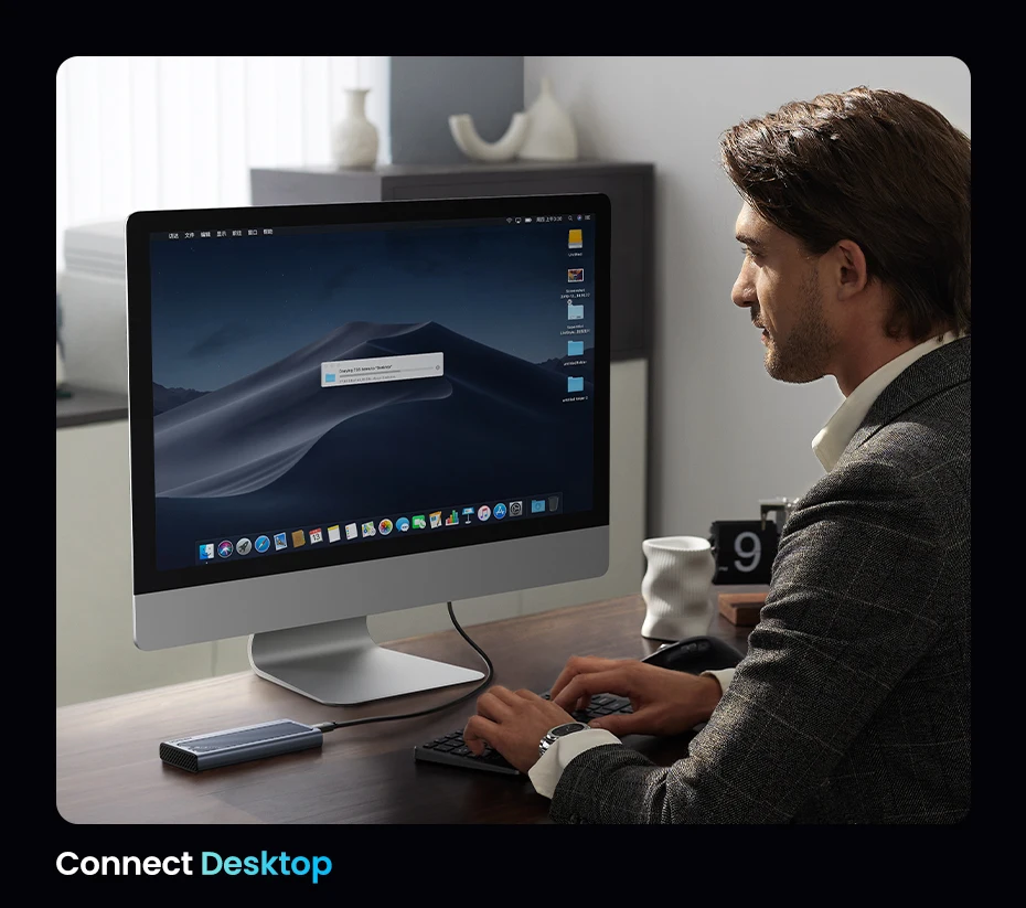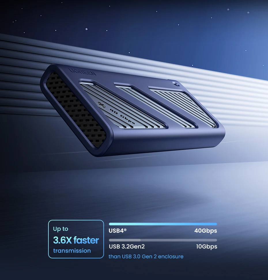 Velocidad de transferencia teórica de 40 Gbps, con velocidades de lectura medidas reales que alcanzan hasta 3600 MB/s.