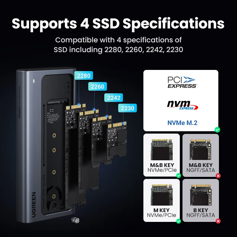 Compatible con 4 especificaciones de SSD que incluyen 2280, 2260, 2242, 2230
