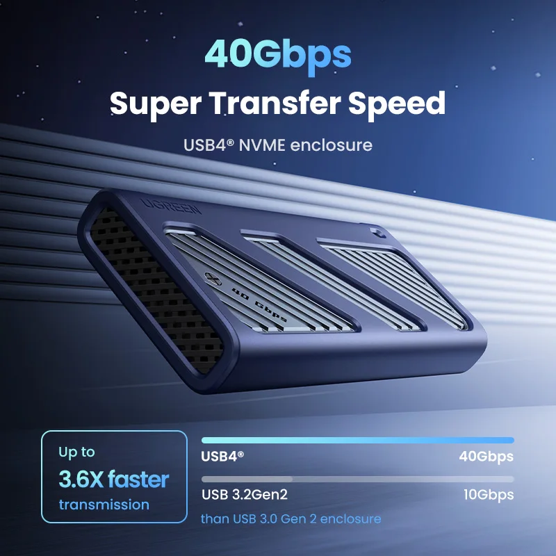 Velocidad de transferencia teórica de 40 Gbps, con velocidades de lectura medidas reales que alcanzan hasta 3600 MB/s.
