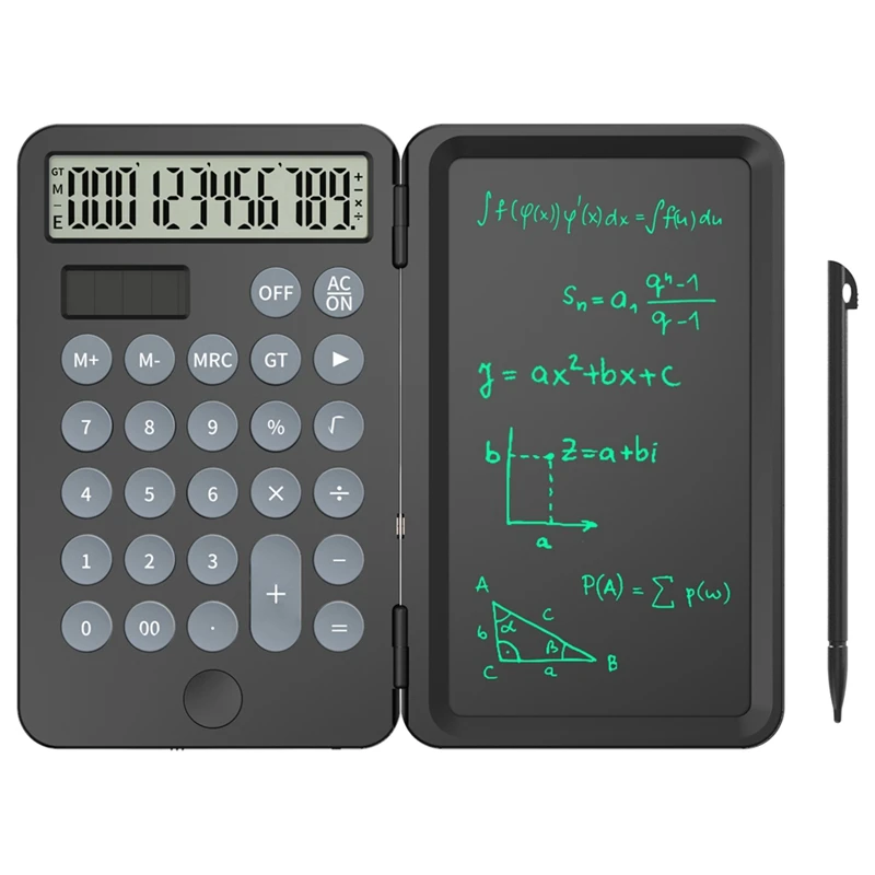 Práctica tableta de escritura LCD con calculadora adjunta, plegable pero no desmontable.