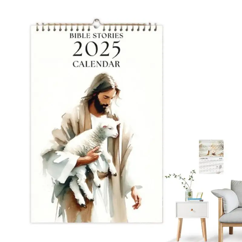 Calendario de pared de la Biblia mensual de 2025, 12 meses, calendario de pared con encuadernación de alambre y gancho, cuentos de la Biblia cristiana de 2025 para decoración del hogar