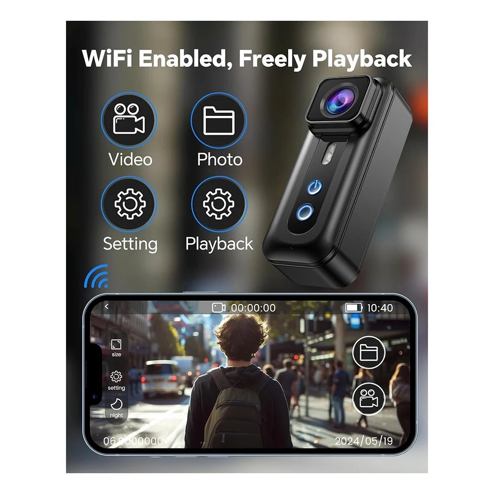[Cámara corporal 1080P con lente ancha de 145 grados] La innovadora fusión de una claridad incomparable con resolución 1080P, elevando su perspectiva a nuevas alturas. [Conectar WIFI a su teléfono móvil] Utilice la aplicación incluida para conectarse sin problemas a su teléfono para obtener una vista previa y edición rápida de archivos. Nota: Tenga en cuenta que la cámara corporal debe estar a los 3 metros posteriores a su teléfono. [Diseño de batería recargable de 800 mAh] La cámara graba hasta 150 minutos con una resolución de 1080P, lo que garantiza la captura ininterrumpida de sus momentos con una claridad asombrosa. [Clip trasero proporcionado] Una cámara versátil que se usa en el cuerpo que se puede conectar fácilmente a su ropa usando el clip trasero para grabar o montar en su casco para capturar sus paseos. [Pequeño y compacto con fácil operación] Se puede guardar en el bolsillo en cualquier momento, excelente equipo para caminatas, conferencias o pasear mascotas. Encendido con un botón y luego grabación. Ahorro de tiempo para situaciones urgentes Color: Negro Material: Plástico Contenido del paquete: 1x cámara corporal 1x cable USB Solo el contenido del paquete anterior, otros productos no están incluidos. Nota: Los reflejos de la luz y las diferentes pantallas pueden hacer que el color del elemento en la imagen sea un poco diferente al real. El error de medición permitido es +/- 1-3 cm.