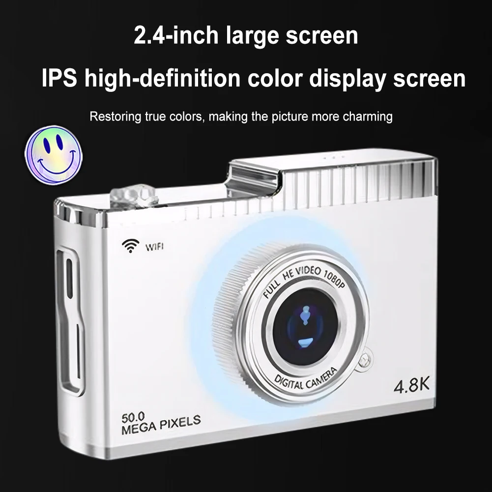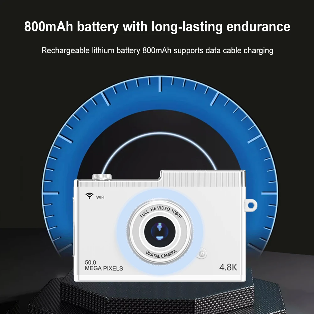 1. Pantalla vívida y portabilidad:La cámara digital cuenta con una pantalla a color IPS HD de 2,4 pulgadas que restaura los colores verdaderos, haciendo que sus imágenes sean más cautivadoras. Su tamaño compacto y diseño elegante hacen que sea fácil de llevar en su bolso. Con una batería integrada de 800mAh, admite la carga del cable de datos, lo que le permite grabar continuamente sin preocuparse por la energía.
