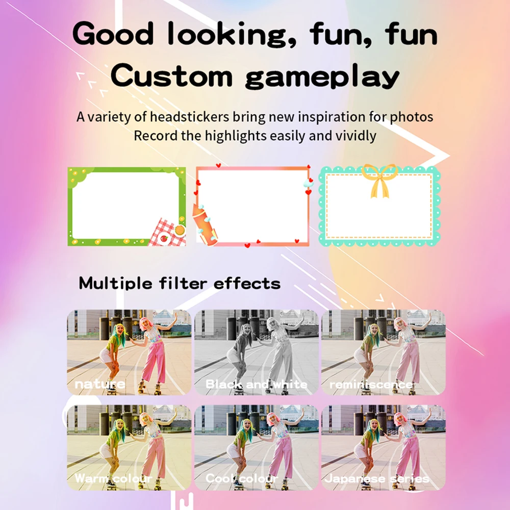 3. [Diversión y creatividad] nuestra cámara digital viene con una variedad de bonitas pegatinas de avatar, bonitos marcos de fotos y 6 filtros, lo que le permite agregar un estilo personal a sus fotos y hacer que cada una sea única.