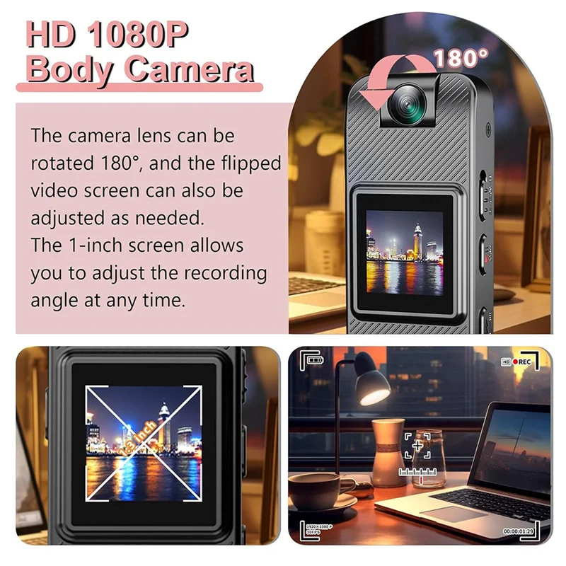 [Pantalla de 1,3 pulgadas y lente giratoria] Cámara montada en el cuerpo con una pantalla HD de 1,3 pulgadas y 180° La lente giratoria le permite ver la grabación en tiempo real, ajustar el ángulo de grabación y girar la lente a tiempo.No se requiere ninguna computadora portátil ni otro equipo para ver la reproducción.