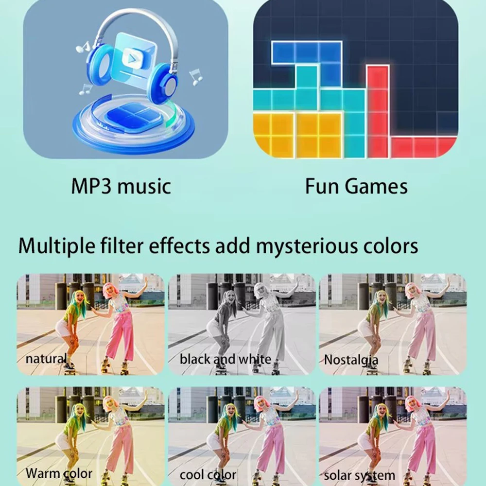 Otras características: juegos divertidos, reproducción para ver archivos, eliminación de archivos, filmación de cuenta regresiva, pegatinas para la cabeza, filtros, nitidez