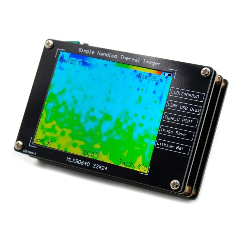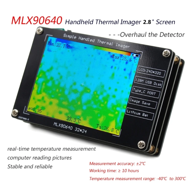 La resolución de la pantalla de 2,8 "es de 320x240; la pantalla puede mostrar y rastrear la temperatura máxima, la temperatura mínima y la temperatura del punto central.