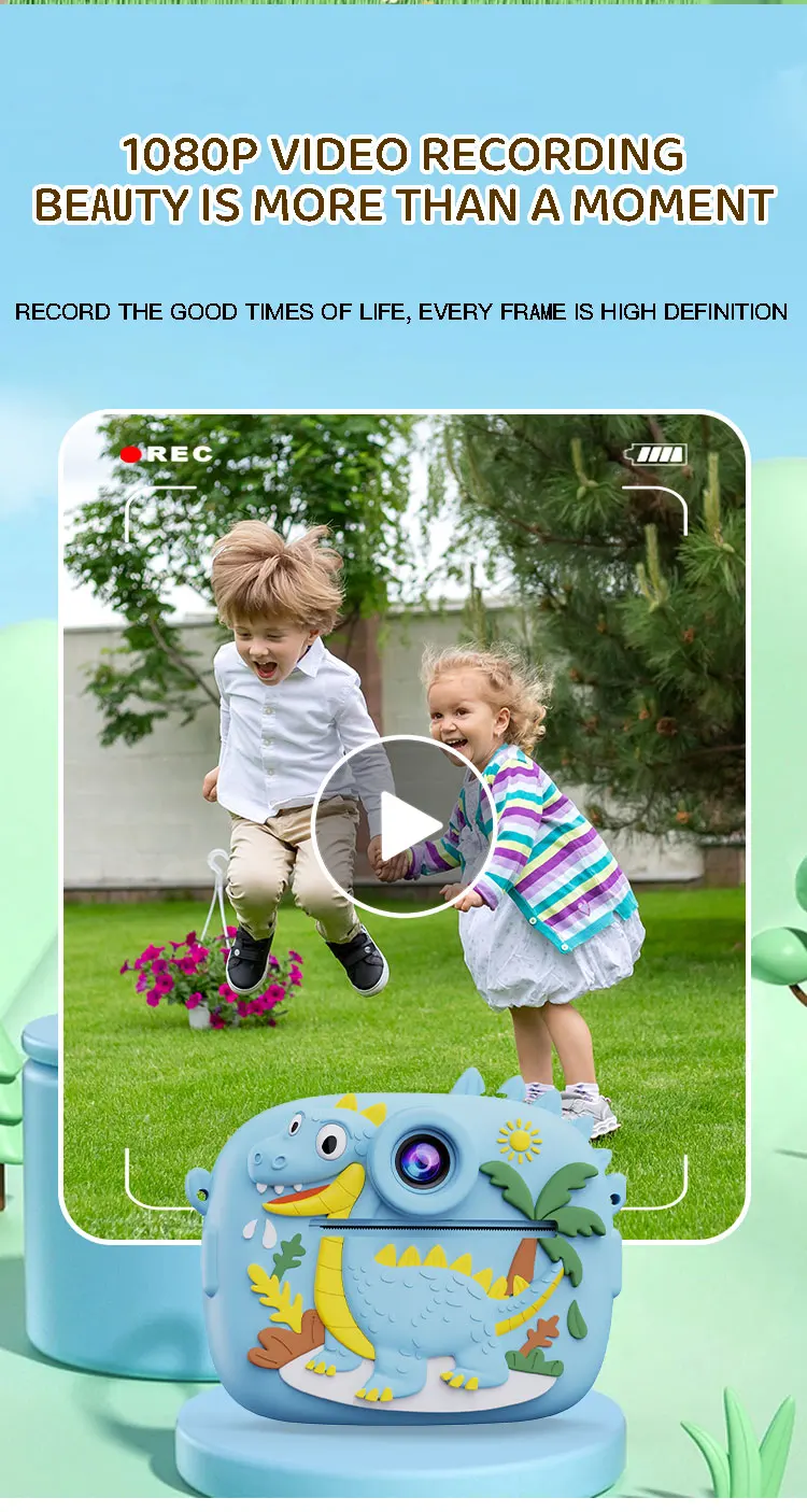 Cámara de impresión instantánea con forma de pequeño dinosaurio, cámara Dual 1080P HD, impresión instantánea con 3 rollos de papel para impresora, tarjeta de memoria de 32GB