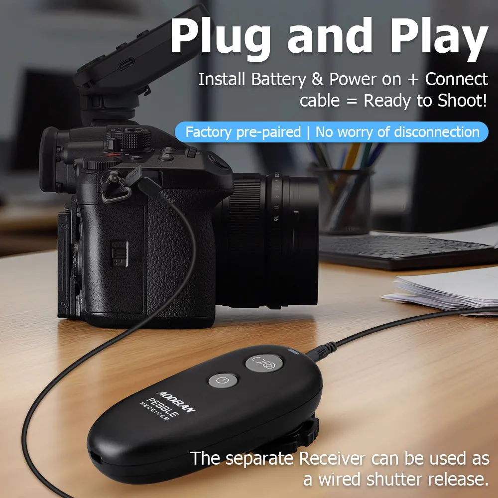 El transmisor puede controlar el receptor de forma inalámbrica para realizar enfoque automático, disparo único, liberación retardada y liberación continua.(el receptor no necesita ocupar la zapata de la cámara).