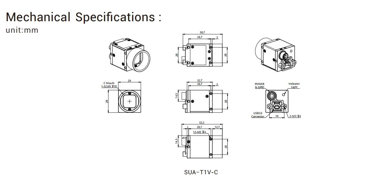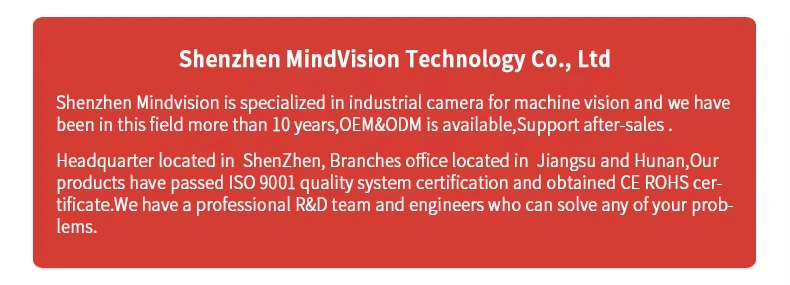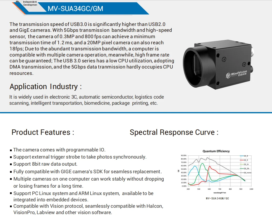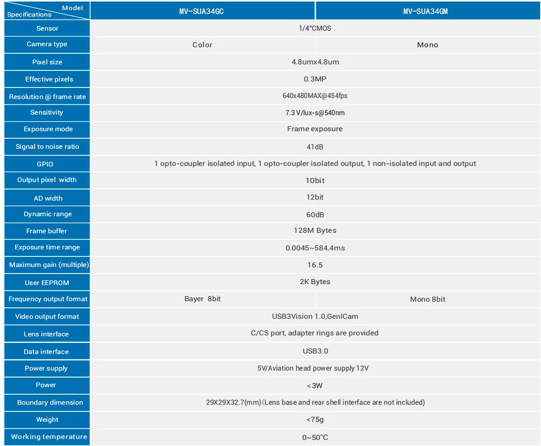 Información del producto Artículo del producto Cámara USB Industrial MindVision Cámara de visión de máquina de obturador global de alta velocidad de fotogramas SDK Número de modelo MV-SUA34GC/M Píxeles 0,3 MP Resolución 640*480 Frecuencia de fotogramas (fps) 454 Color Monocromo/Color Sensor CMOS de obturador global de 1/4" Tamaño de píxeles 4,8 μm Tiempo de exposición (ms) 0.0045~~584.4 Profundidad de píxeles 8 bits Montaje de lente Boca CS predeterminada GPIO 1 entrada de disparo, 1 salida de control de flash, 1 salida GPIO Interfaz de datos Interfaz USB3.0 Buffer de marco 128 millones de bytes Área de datos definida por el usuario 2K bytes Requisitos de energía 5V Dimensiones 29*29*32,7(mm) peso 75 g Temperatura de funcionamiento 0~50℃ Idioma de programación C/C+ +/C#/VB6/VB.NET/Delphi/BCB/Python Sistema operativo WINXP, WIN7/8/10 Sistemas de 32 y 64 bits, Linux y ARM Linux y Android conductor DirectShow Halcon Labview OCX TWAIN