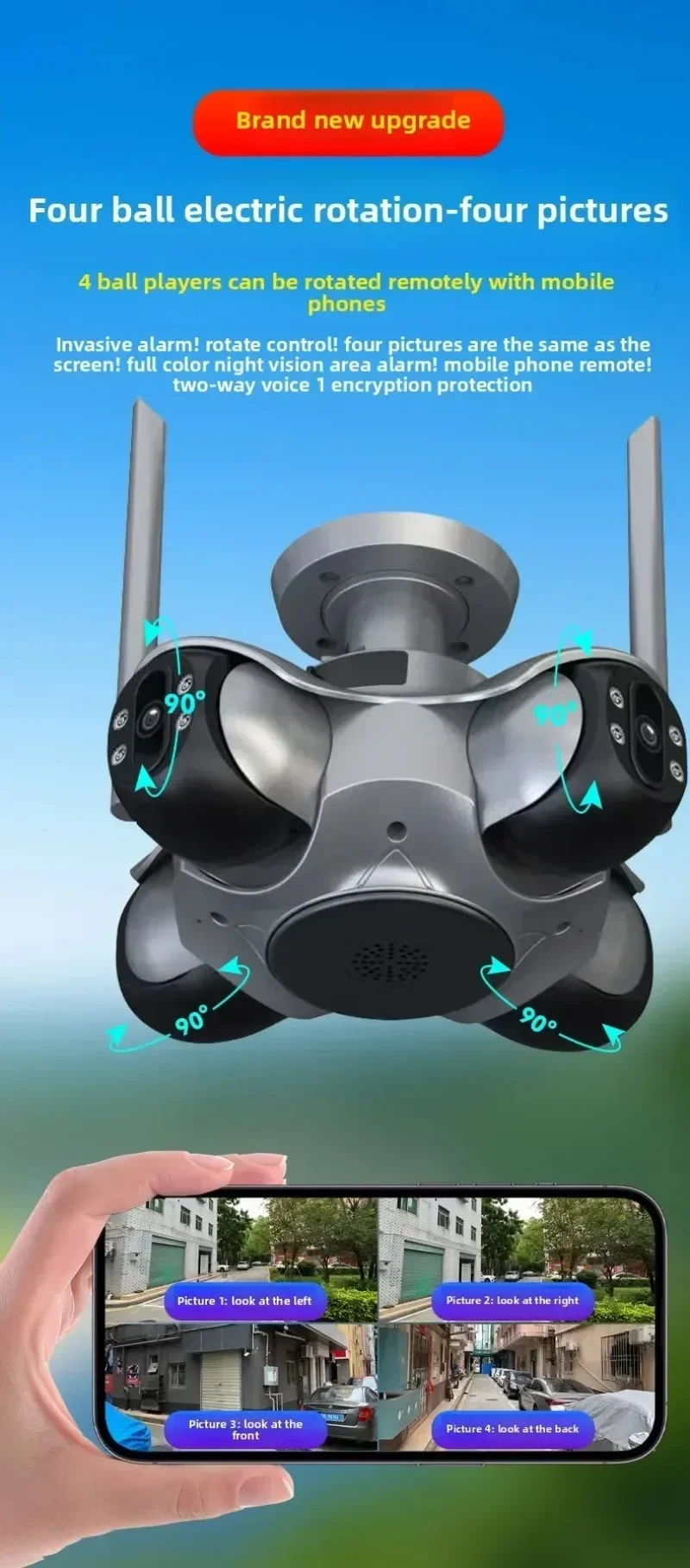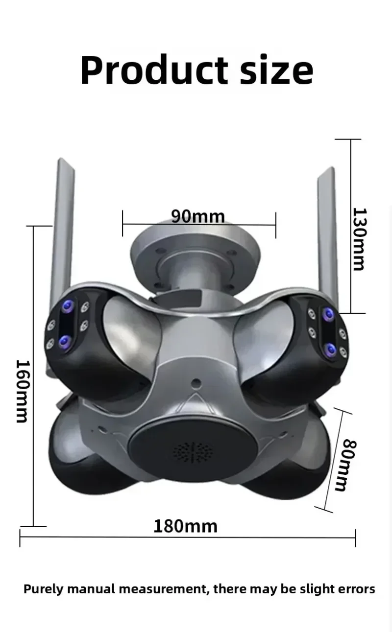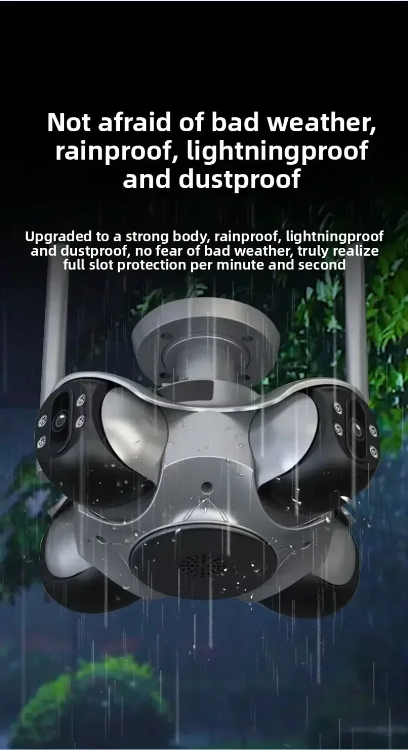 Características:* Cuatro lentes y cuatro pantallas: la cámara de cuatro lentes puede girar hacia arriba y hacia abajo, hacia la izquierda y hacia la derecha, y puede controlarse mediante el teléfono móvil.Puede ver la pantalla de monitoreo en cualquier dirección, con un campo de visión más amplio.Se pueden ver cuatro pantallas al mismo tiempo, con gran angular + teleobjetivo, y se puede lograr un monitoreo claro incluso a larga distancia.360° Vista panorámica, monitoreo integral y diga adiós completamente a los puntos ciegos.