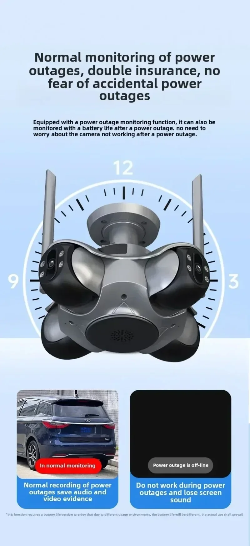 * No hay necesidad de preocuparse por cortes de energía: Equipada con función de monitoreo de cortes de energía, puede continuar monitoreando después de cortes de energía, por lo que no hay necesidad de preocuparse de que la cámara no funcione después de cortes de energía.