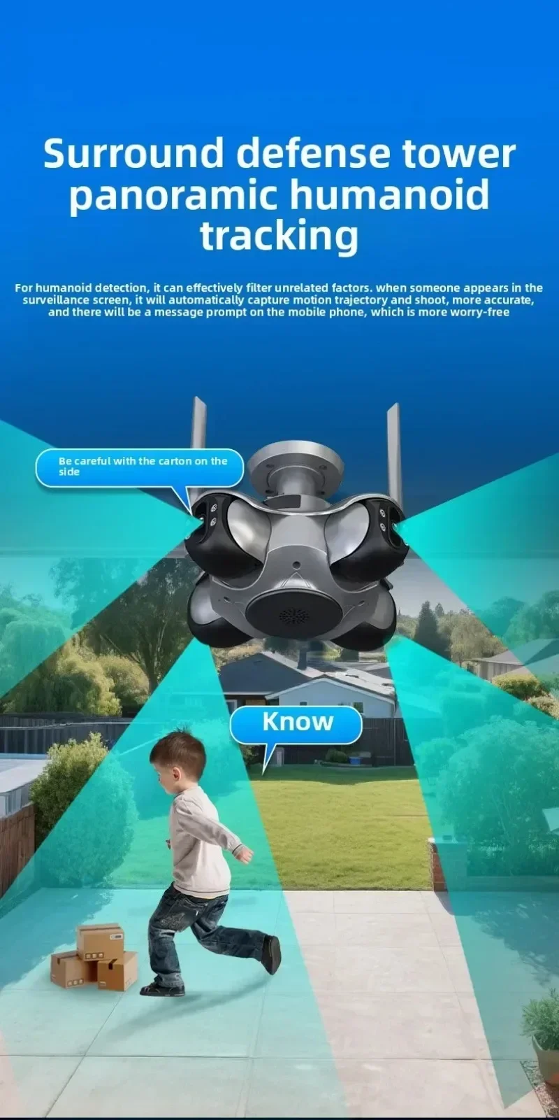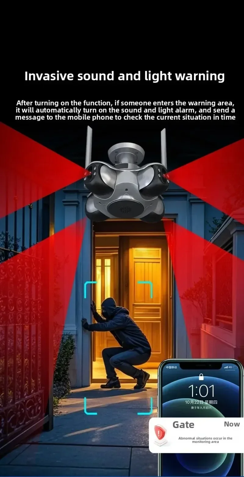 * Alarma de luz y sonido de intrusión: después de encender la función, si alguien invade el área de advertencia, la alarma de luz y sonido se activará automáticamente y se enviará un mensaje al teléfono móvil para verificar la situación actual a tiempo.