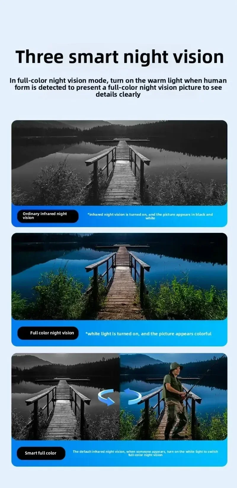 * 3 modos de visión nocturna: los tres modos de visión nocturna son visión nocturna infrarroja ordinaria, visión nocturna a todo color e inteligente a todo color.En el modo de visión nocturna a todo color, la luz cálida se enciende cuando se detecta una figura humana, presentando una imagen de visión nocturna a todo color para ver los detalles con claridad.