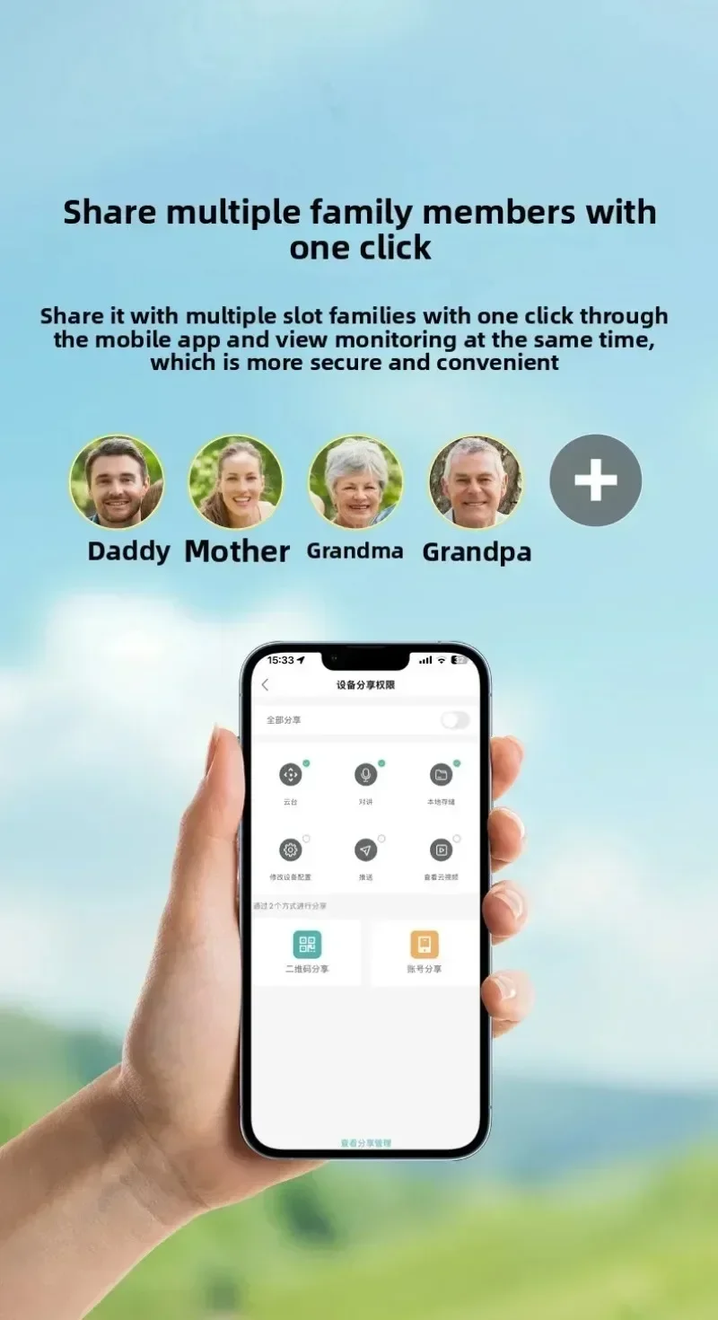 * Compartir con un clic: comparta con varios miembros de la familia a través de la aplicación del teléfono móvil con un clic para ver el monitoreo al mismo tiempo, lo cual es más seguro y conveniente.