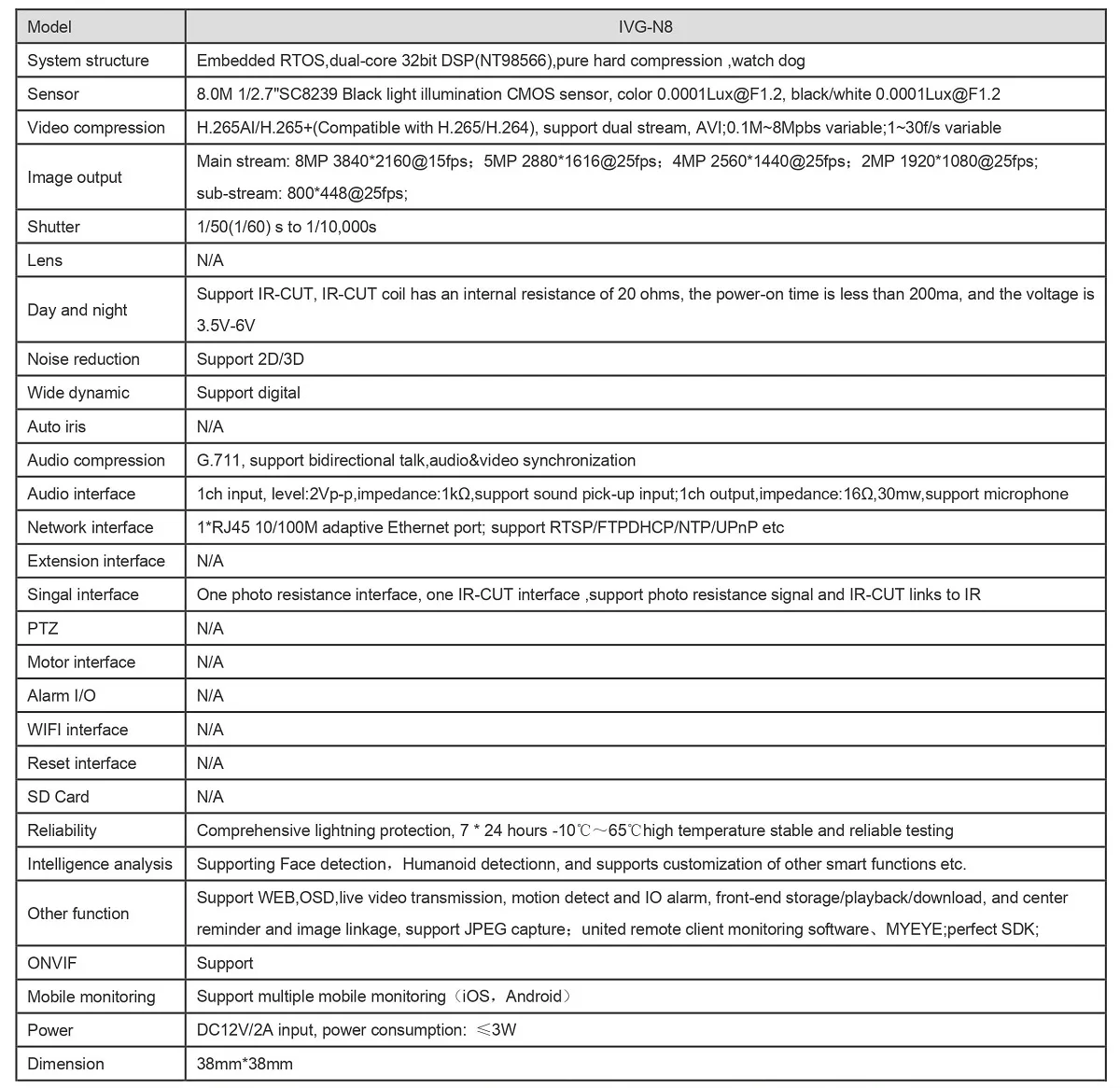 8MP:1/2.7 SC8239 Cmos sensor cloor 0.1lux F1.2 blanco y negro 0.01lux F1.2