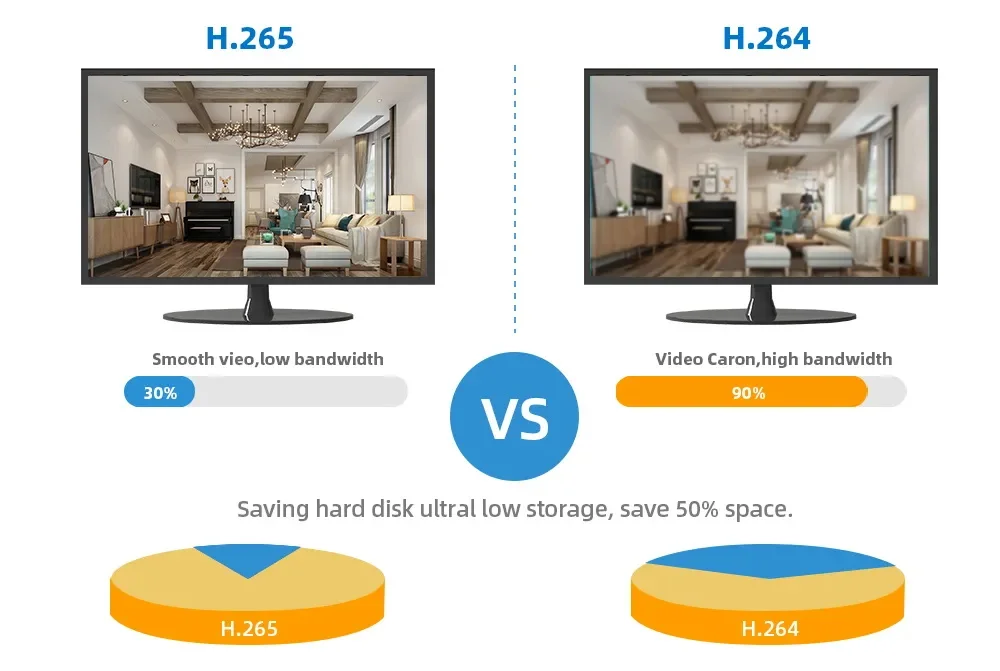 Ahorre 50% de espacio de almacenamiento. Proporciona hasta un 50% de mejora excelente del ancho de banda, una velocidad de transmisión de imagen más rápida y disfruta de una velocidad de reproducción de vídeo más fluida.