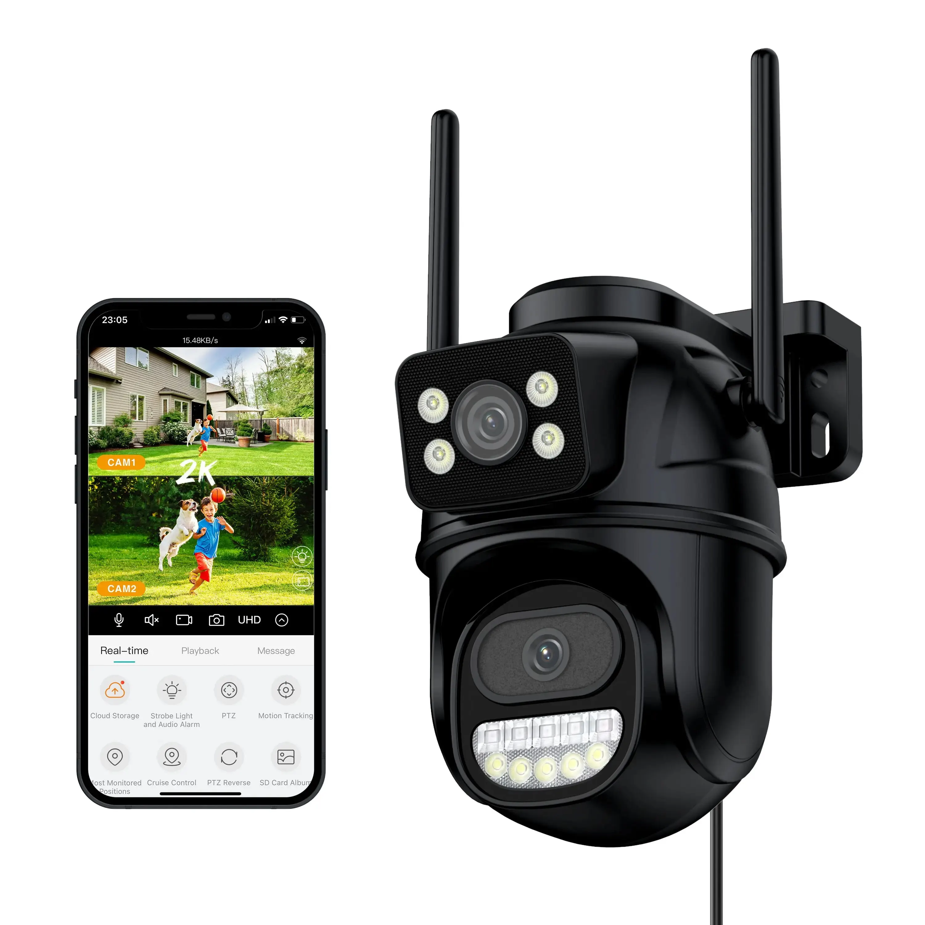 Lente dual, pantalla dual, zoom 4x, alarma de luz de policía, seguimiento humanoide, intercomunicador de Voz bidireccional 360 monitoreo, visión nocturna a todo color, impermeable IP66, monitoreo remoto de teléfono móvil, compartir video, almacenamiento en tarjeta SD, grabación de vídeo las 24 horas